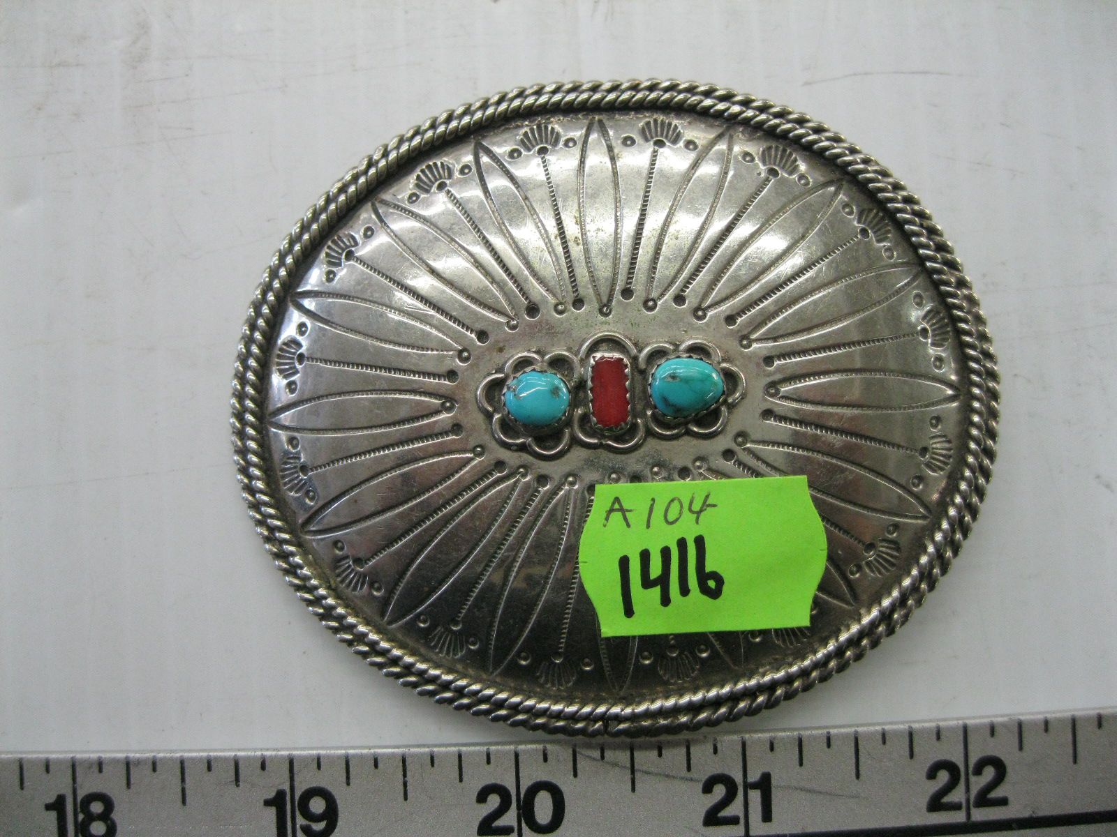 NAVAJO BELT BUCKLE W/TURQUOISE & CORAL COLORED STONES