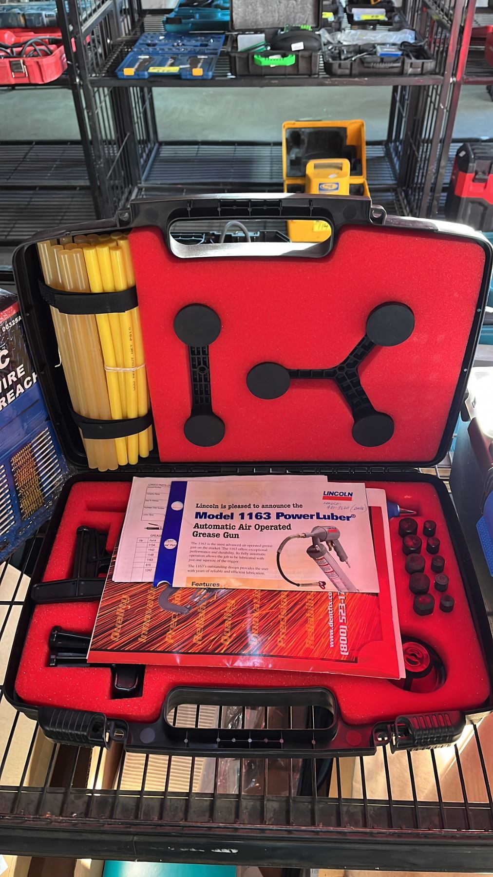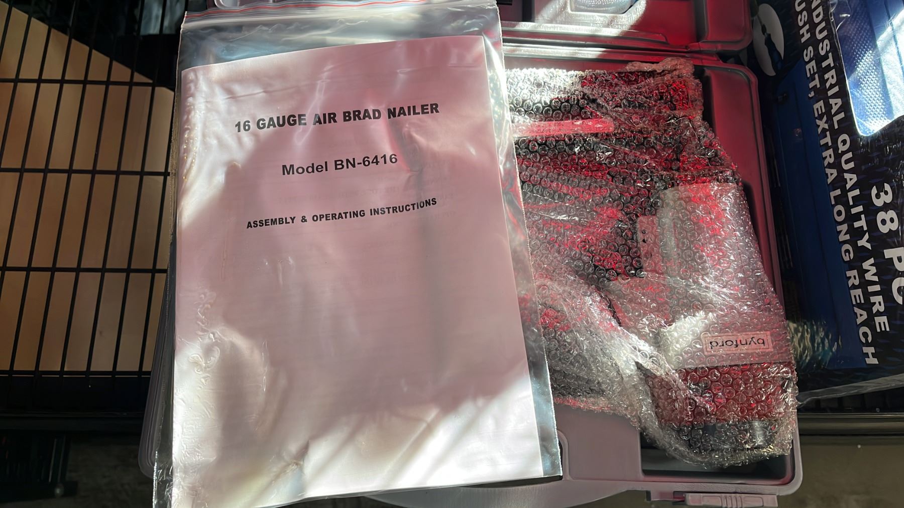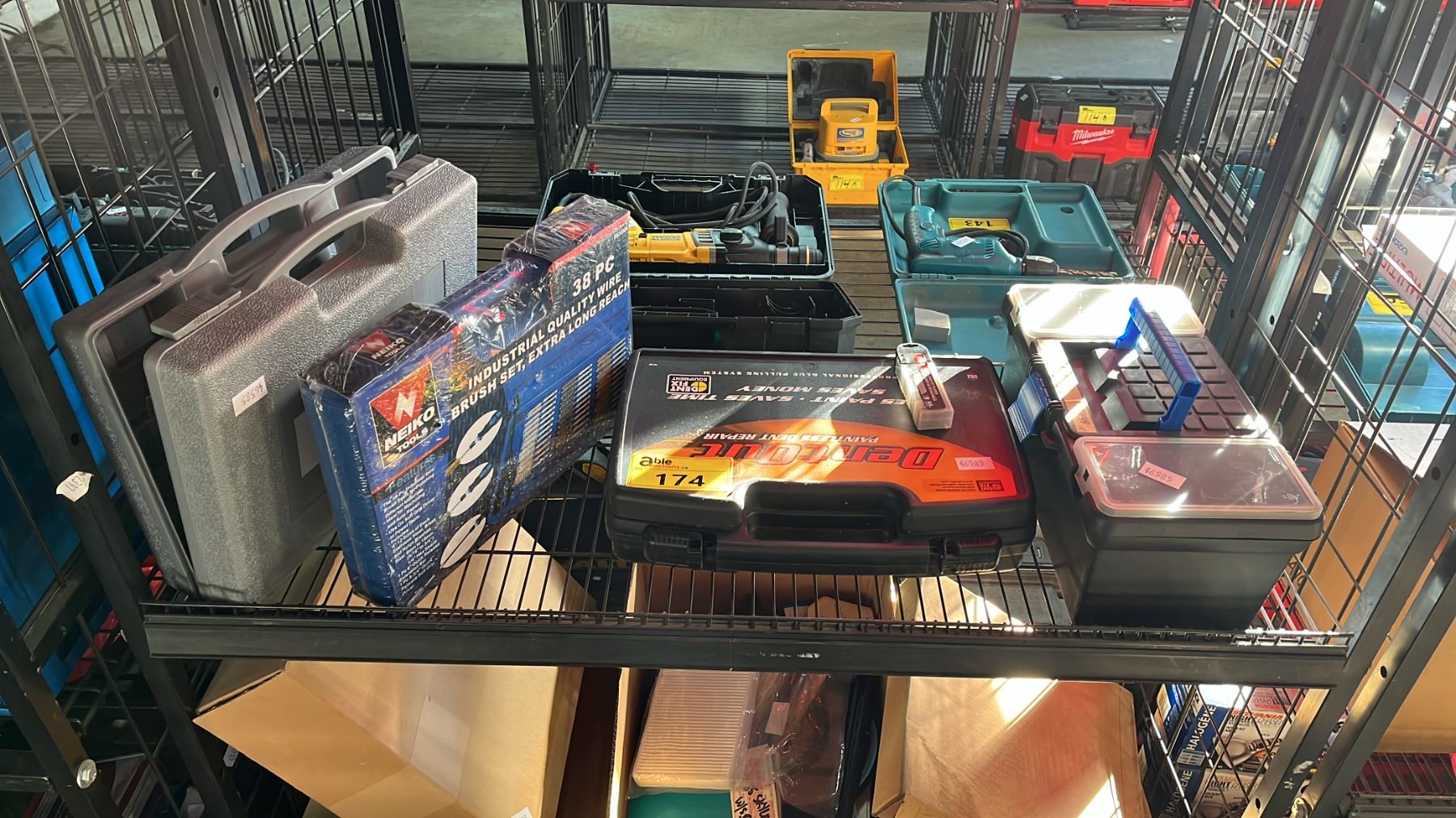 NEIKO TOOLS 38 PC INDUSTRIAL EXTRA LONG REACH QUALITY WIRE BRUSH SET IN A HARD TRANSPORT CASE, BYNFORD PNEUMATIC BRAD NAILER IN A HARD TRANSPORT CASE, DENTOUT PAINTLESS DENT REPAIR & SMALL PLASTIC TOOL BOX WITH SMALL HAND TOOLS
