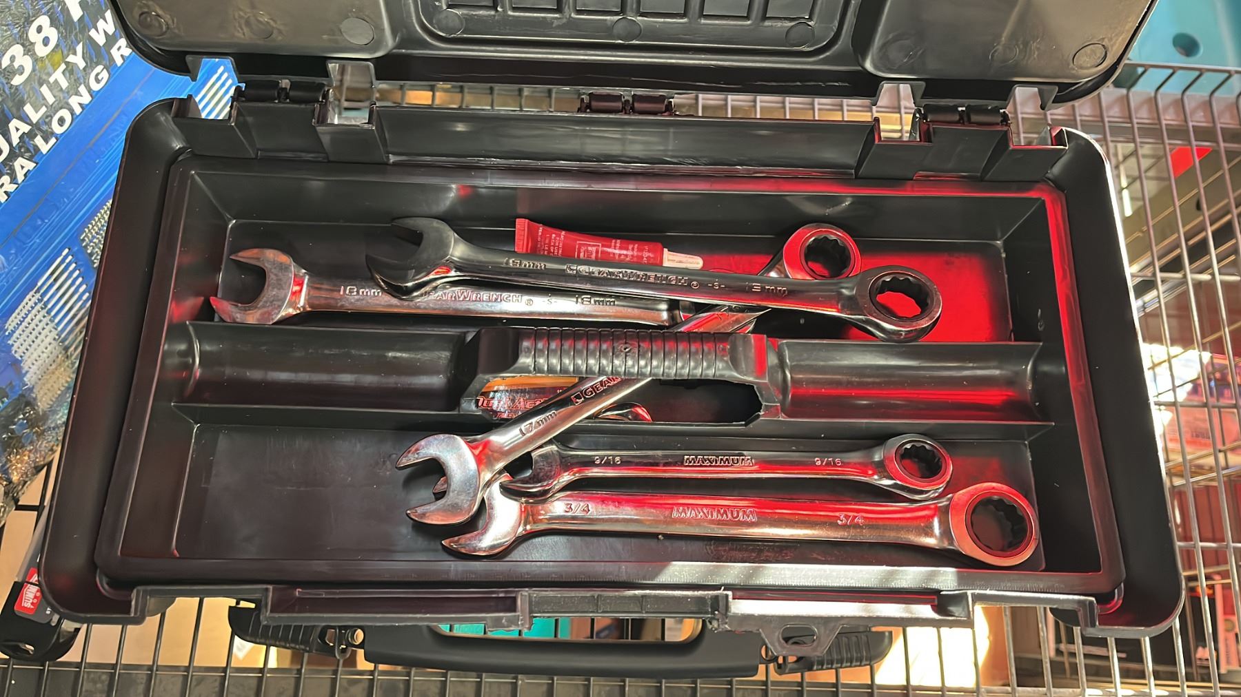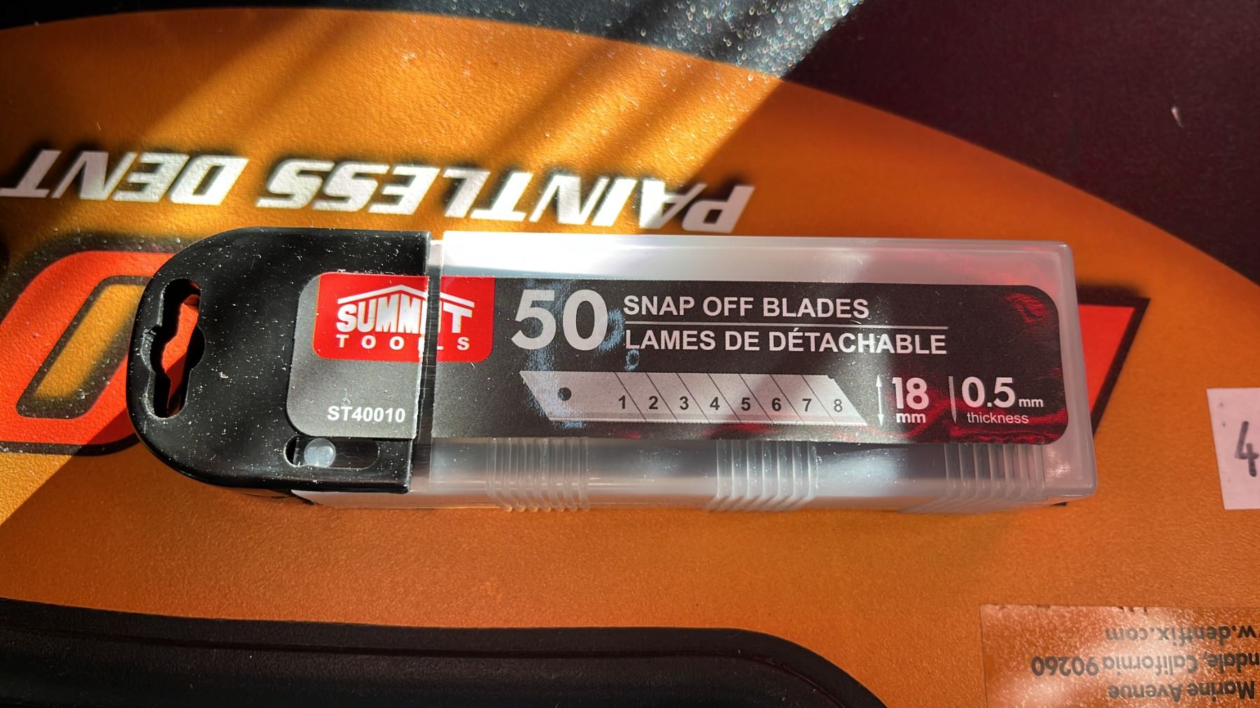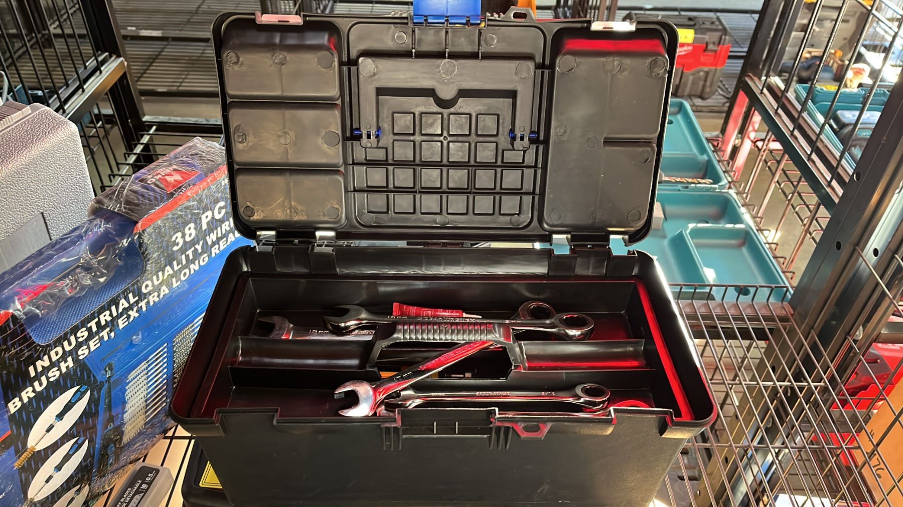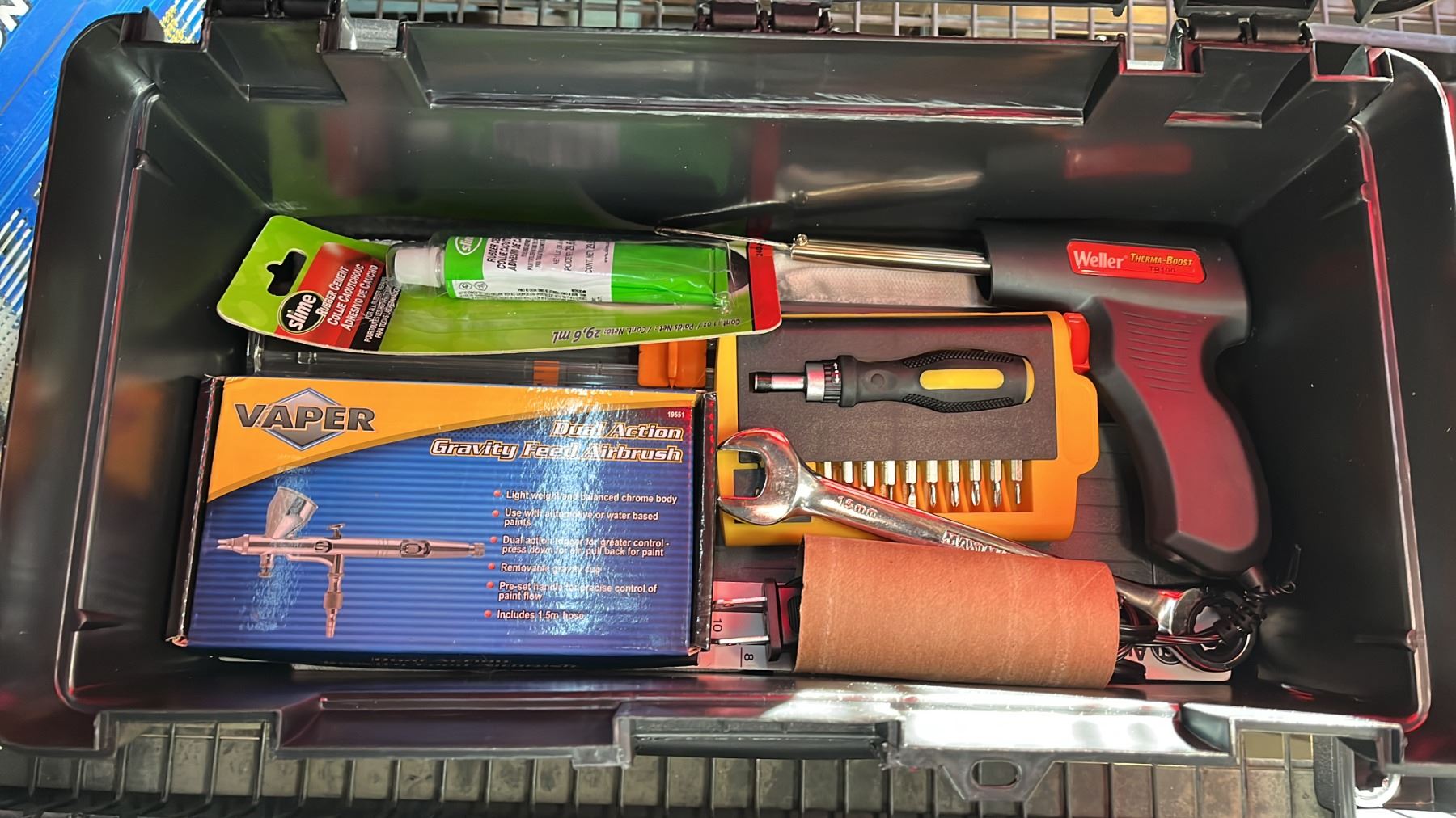 NEIKO TOOLS 38 PC INDUSTRIAL EXTRA LONG REACH QUALITY WIRE BRUSH SET IN A HARD TRANSPORT CASE, BYNFORD PNEUMATIC BRAD NAILER IN A HARD TRANSPORT CASE, DENTOUT PAINTLESS DENT REPAIR & SMALL PLASTIC TOOL BOX WITH SMALL HAND TOOLS
