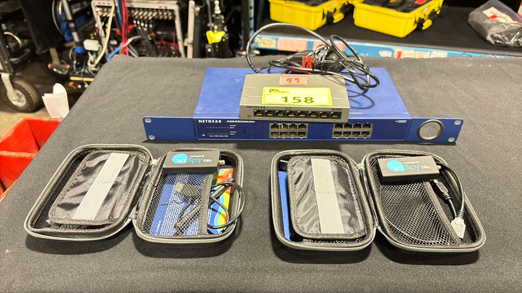NETGEAR RACK MOUNTED 16 PORT ETHERNET SWITCH, NETGEAR 8 PORT ETHERNET SWITCH, & 2 METAGEEK WISPY DBX ANTENNAS IN TRANSPORT CASES
