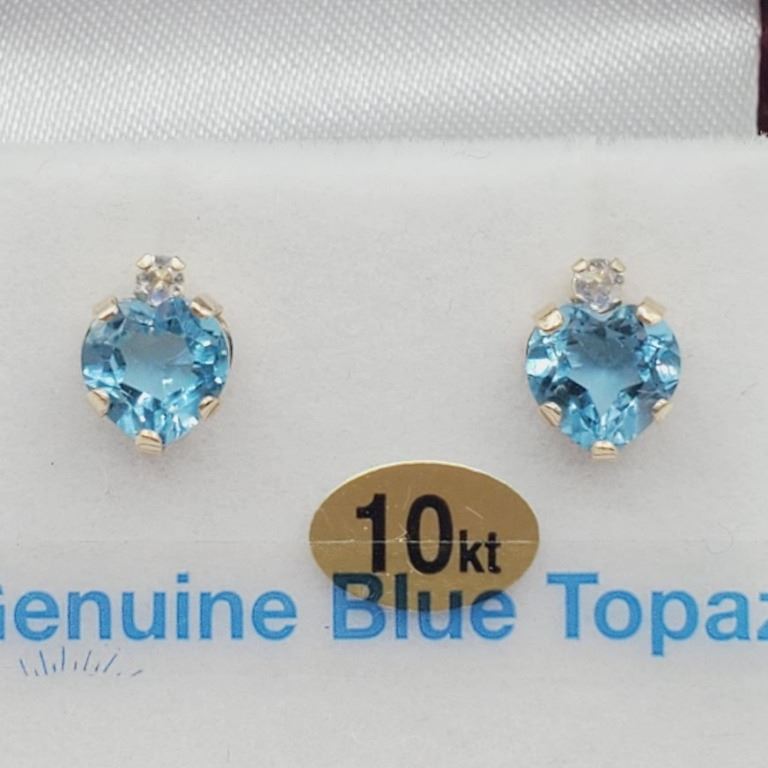 NEW 10KT. YELLOW GOLD 6MM X 6MM GENUINE BLUE TOPAZ & CZ EARRINGS, RETAIL $600.00
