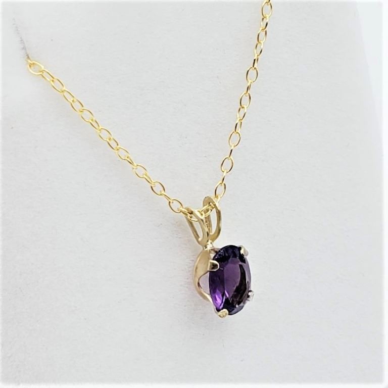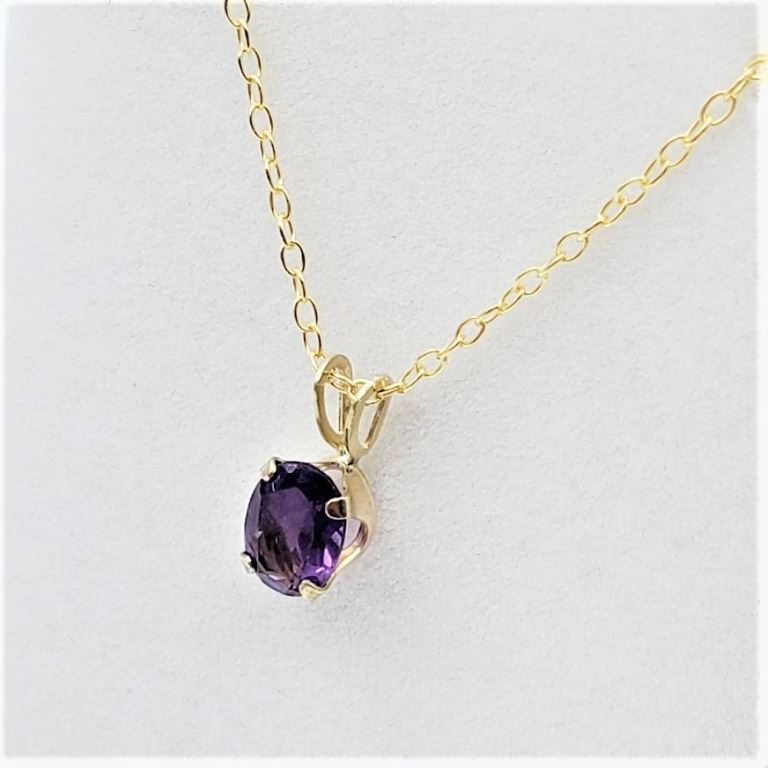 NEW 10KT. YELLOW GOLD 7MM X 5MM GENUINE AMETHYST PENDANT WITH STERLING CHAIN, 0.64CTS, W/A $725.00