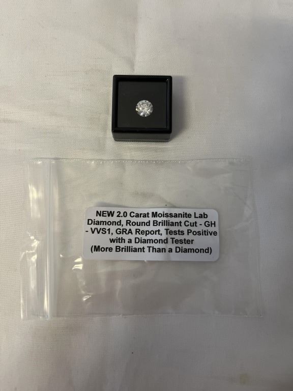 NEW 2.0 CARAT MOISSANITE LAB DIAMOND, ROUND BRILLIANT CUT, GH-VVS1, GRA REPORT, TESTS POSITIVE W/ DIAMOND TESTER (MORE BRILLIANT THAN A DIAMOND)