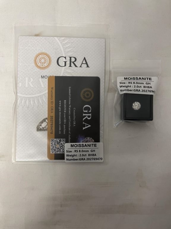NEW 2.0 CARAT MOISSANITE LAB DIAMOND, ROUND BRILLIANT CUT, GH-VVS1, GRA REPORT, TESTS POSITIVE W/ DIAMOND TESTER (MORE BRILLIANT THAN A DIAMOND)