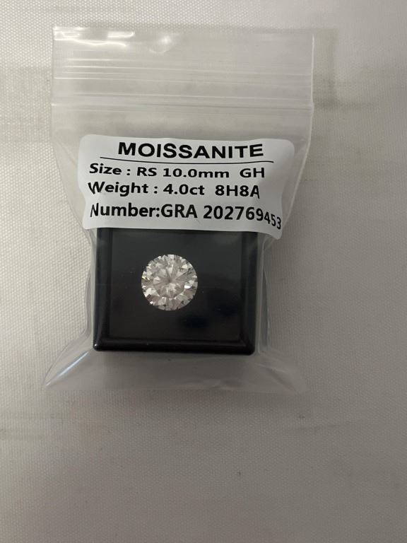 NEW 4.0 CARAT MOISSANITE LAB DIAMOND, ROUND BRILLIANT CUT, GH-VVS1, GRA REPORT, TESTS POSITIVE W/ DIAMOND TESTER (MORE BRILLIANT THAN A DIAMOND)
