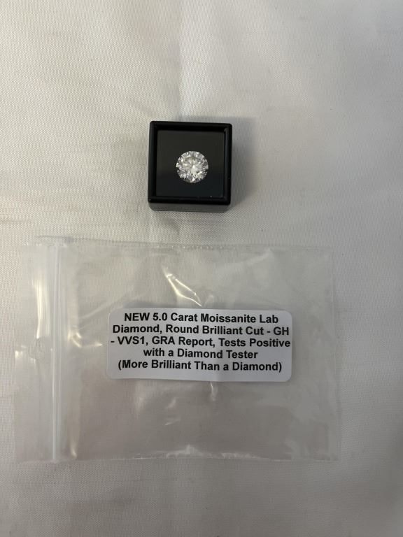 NEW 5.0 CARAT MOISSANITE LAB DIAMOND, ROUND BRILLIANT CUT, GH-VVS1, GRA REPORT, TESTS POSITIVE W/ DIAMOND TESTER (MORE BRILLIANT THAN A DIAMOND)