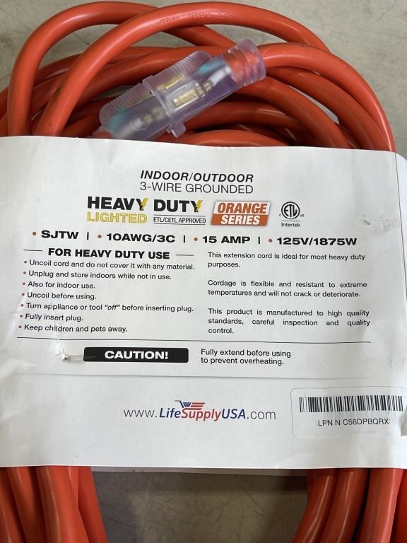 NEW 50FT INDOOR OUTDOOR HEAVY DUTY LIGHTED 3 WIRE EXTENSION CORD, ORANGE 10AWG