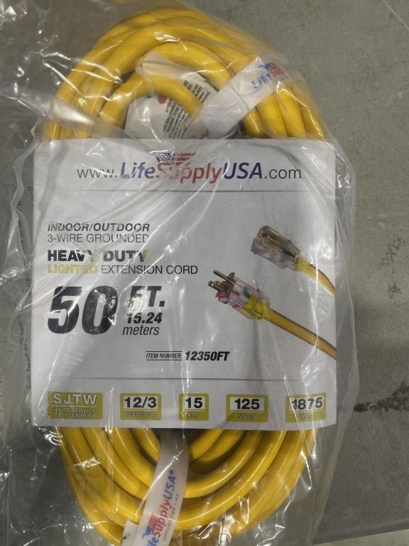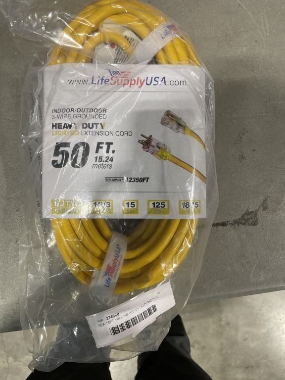 NEW 50FT YELLOW HEAVY DUTY INDOOR OUTDOOR LIGHTED 3 WIRE EXTENSION CORD, 12AWG