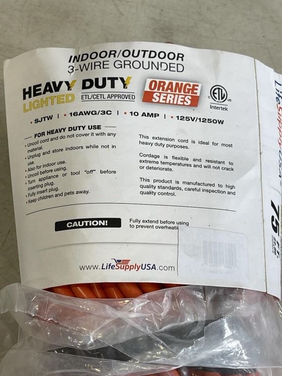 NEW 75FT INDOOR OUTDOOR HEAVY DUTY LIGHTED 3 WIRE EXTENSION CORD, ORANGE 16AWG