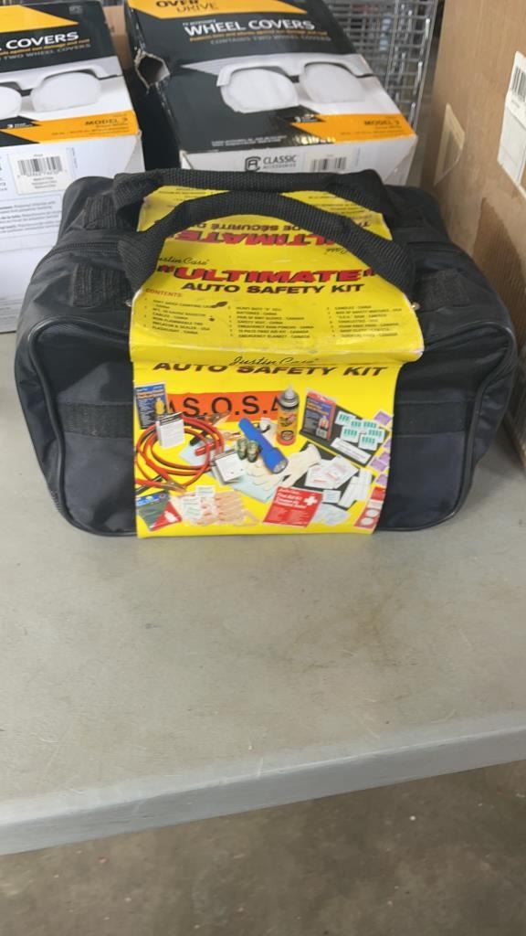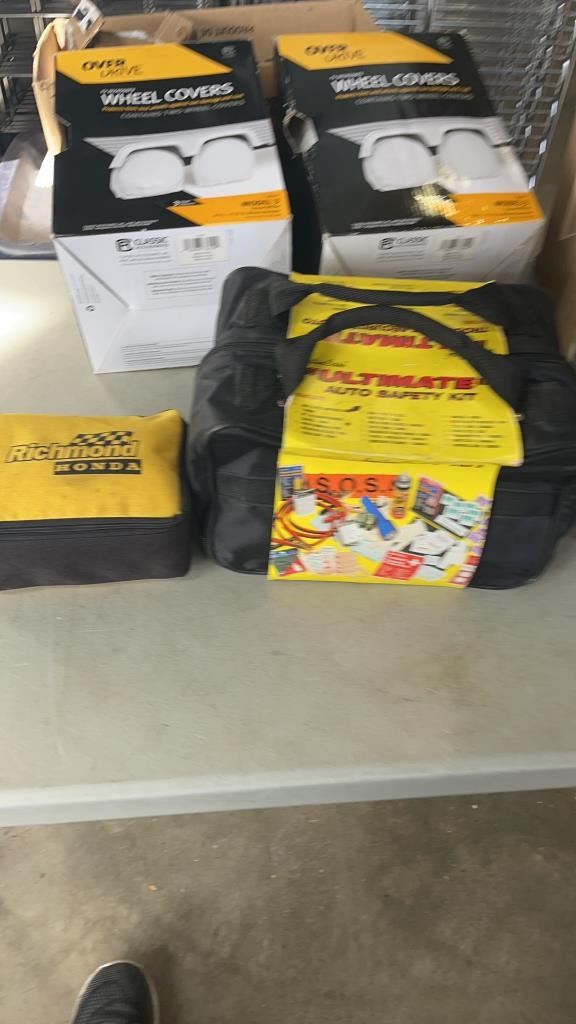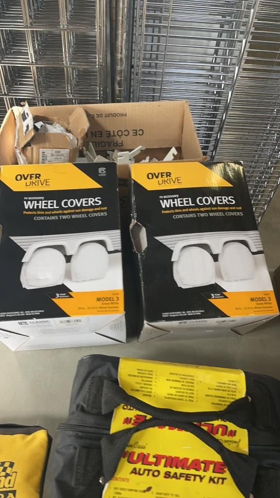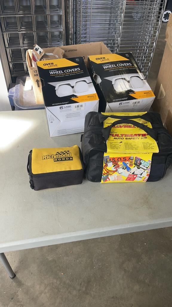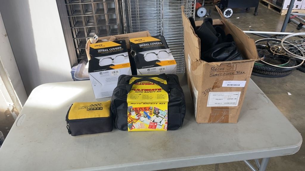 NEW AUTOMOTIVE SAFETY KIT WITH RV WHEEL COVERS AND PORCHE 911 SLANT NOSE BRA