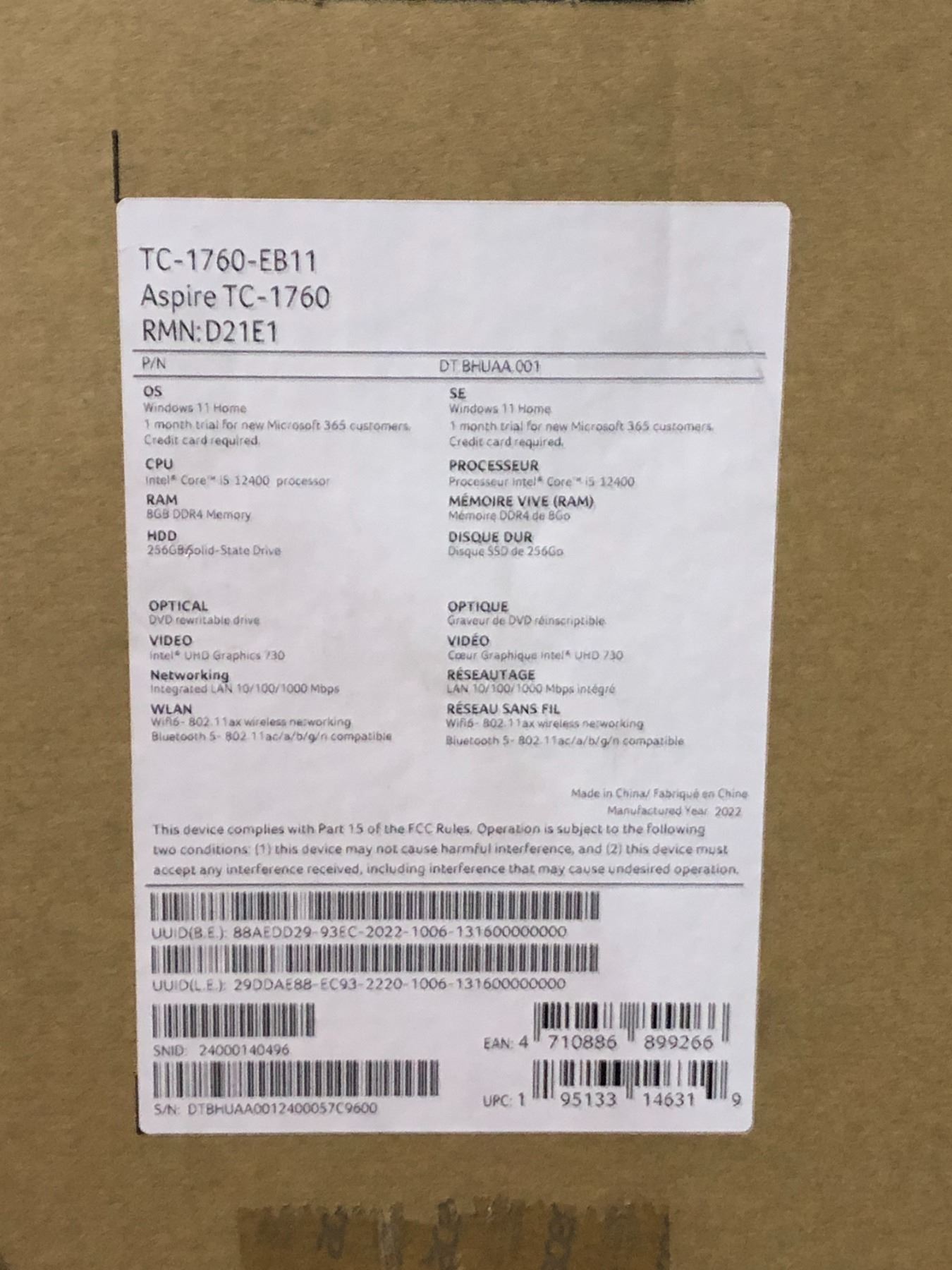 Retail $799 The product's specs are as follows: • 2.5GHz Intel Core i5-12400 hexa-core CPU and 8GB DDR4 3200MHz UDIMM RAM are a powerful combo for completing your tasks at maximum velocity • 256GB solid state drive for high-speed storage that offers boosted performance and rapid file operation • Integrated 10/100/1000 Ethernet and 802.11ax/ac/a/b/g/n Wi-Fi 6 for blazing fast connectivity to wired and wireless networks • Integrated Bluetooth 5.2 lets you connect to wireless speakers, wireless headsets, smartphones, and other compatible devices • Two USB 3.2 Gen 1 Type-A ports, 1 USB 3.2 Gen 1 Type-C port, 4 USB 2.0 Type-A ports, 2 HDMI ports, 1 LAN port, and 5 audio jacks for plugging in various peripherals from input devices to external storage • 5.1 channel surround high-definition audio output for listening to music, watching movies, and more with immersive soundscapes • Preinstalled with a Windows 11 operating system that comes with an intuitive user interface and tough security features