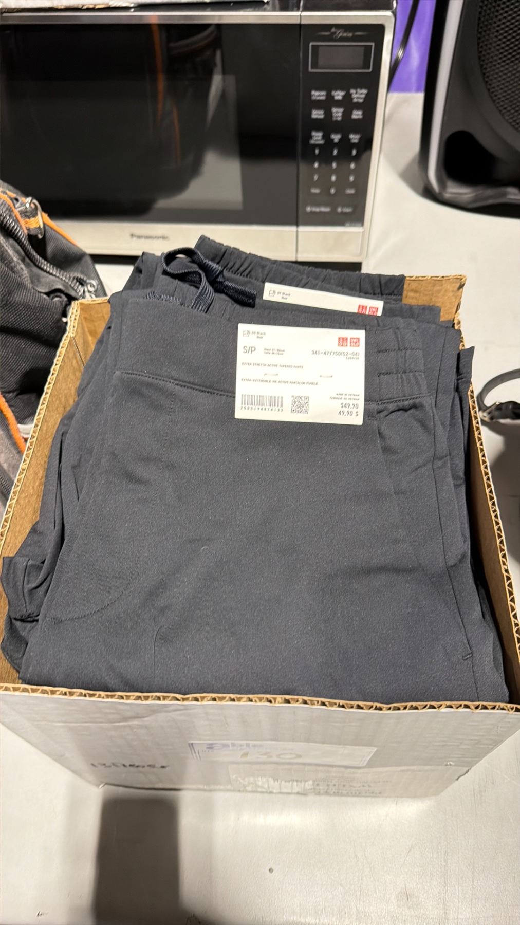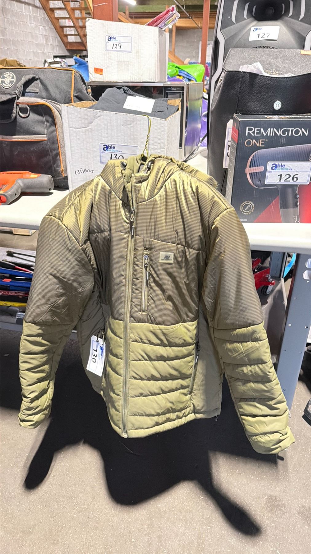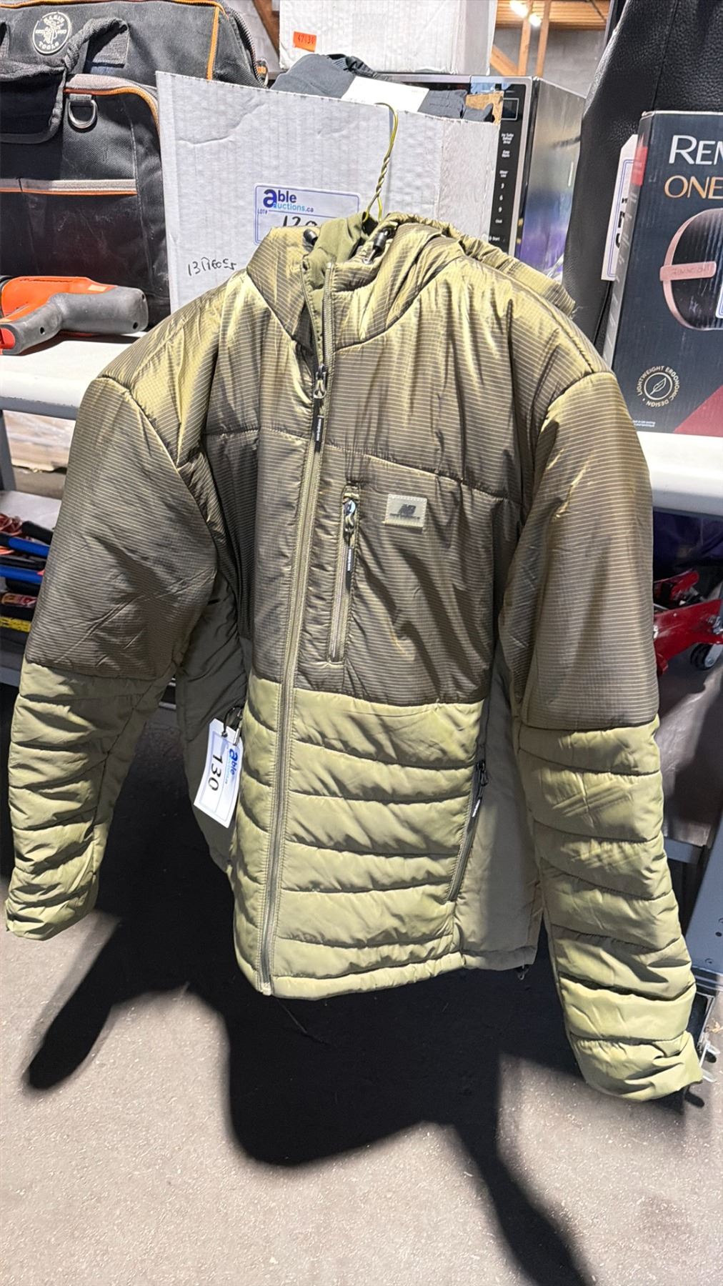 NEW BALANCE GREEN SIZE MED PUFFER JACKET & BOX OF SIZE SMALL / MED BLACK EXTRA STRETCH ACTIVE TAPERED PANTS
