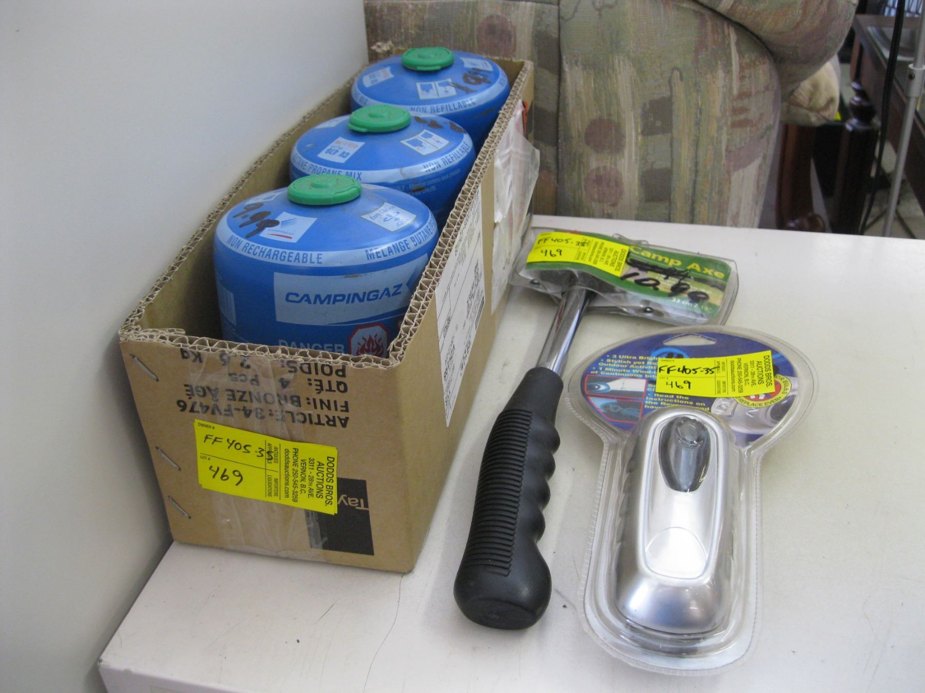 NEW CAMP AXE, FLASHLIGHT, 3 PROPANE CYLINDERS
