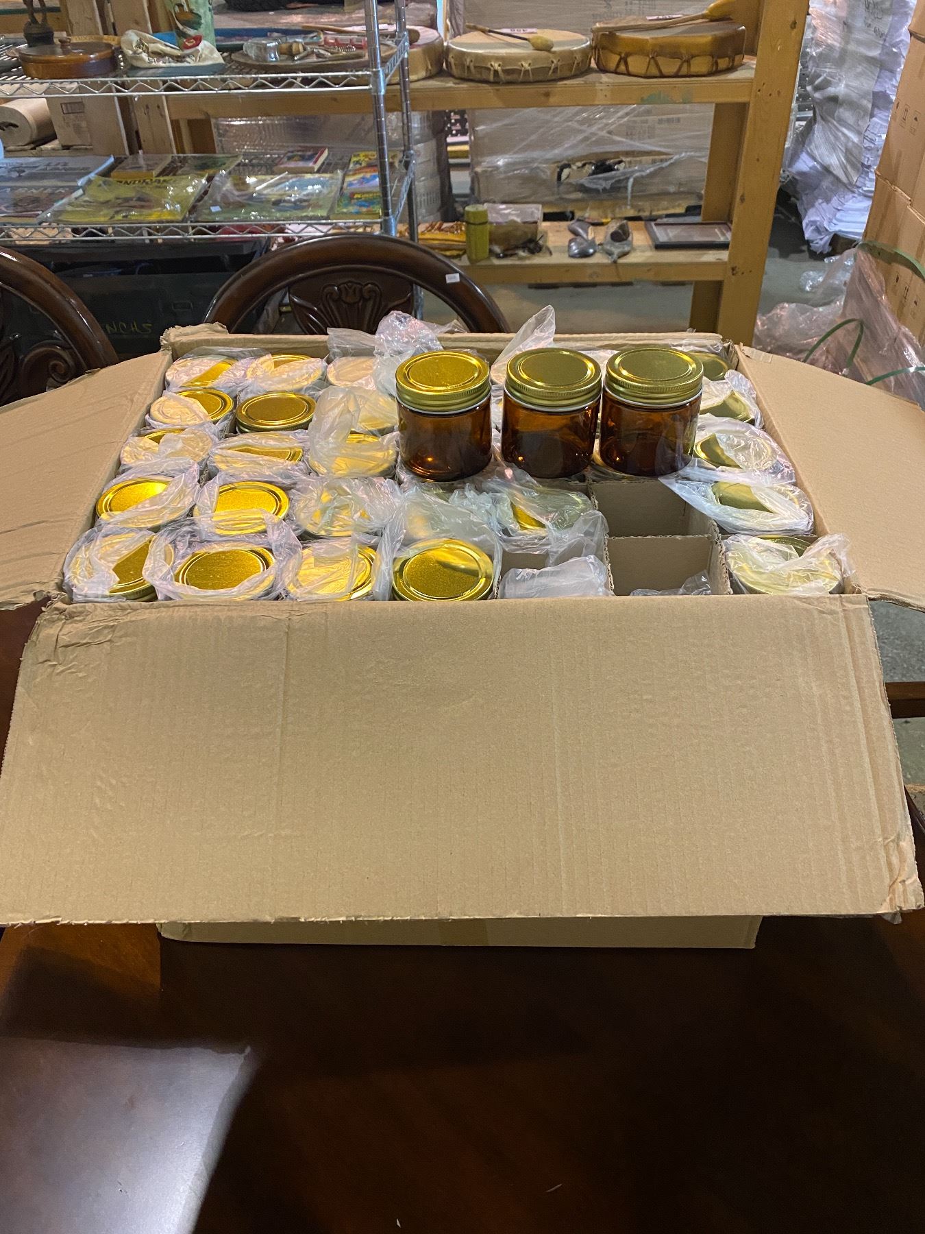 NEW CASE OF 140 AMBER GLASS JARS (180ML) WITH SCREW TOP LIDS