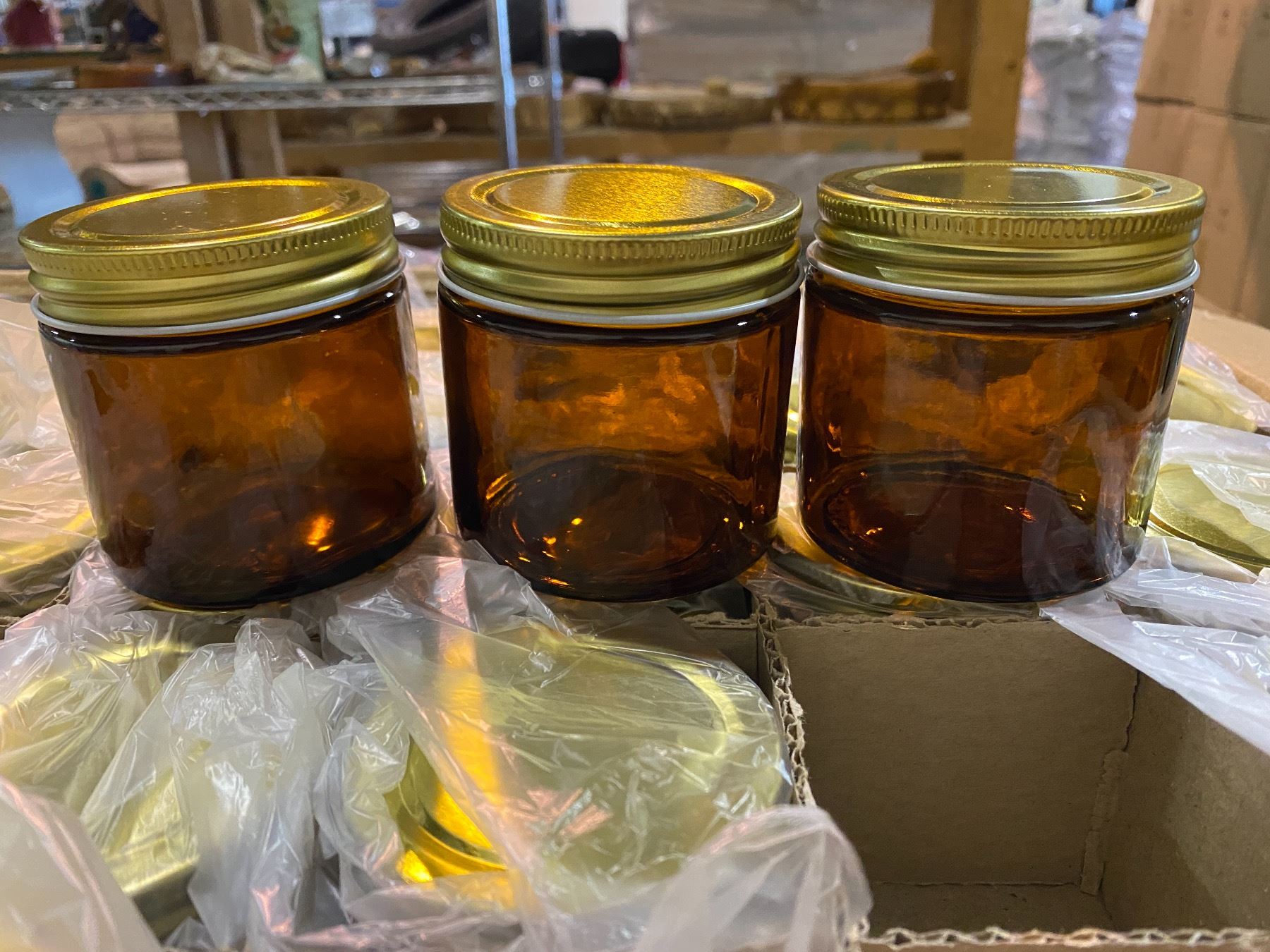 NEW CASE OF 140 AMBER GLASS JARS (180ML) WITH SCREW TOP LIDS