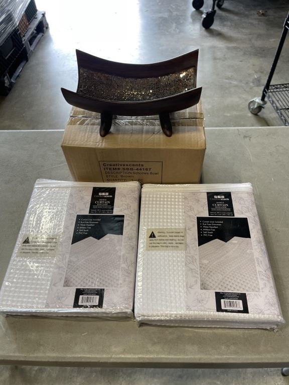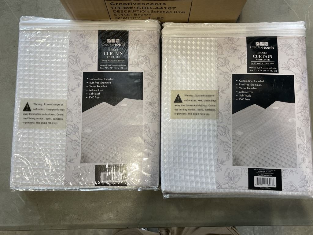 NEW CREATIVE SCENTS SCHONWE BOWL AND 2 WHITE WAFFLE SHOWER CURTAINS WITH LINER
