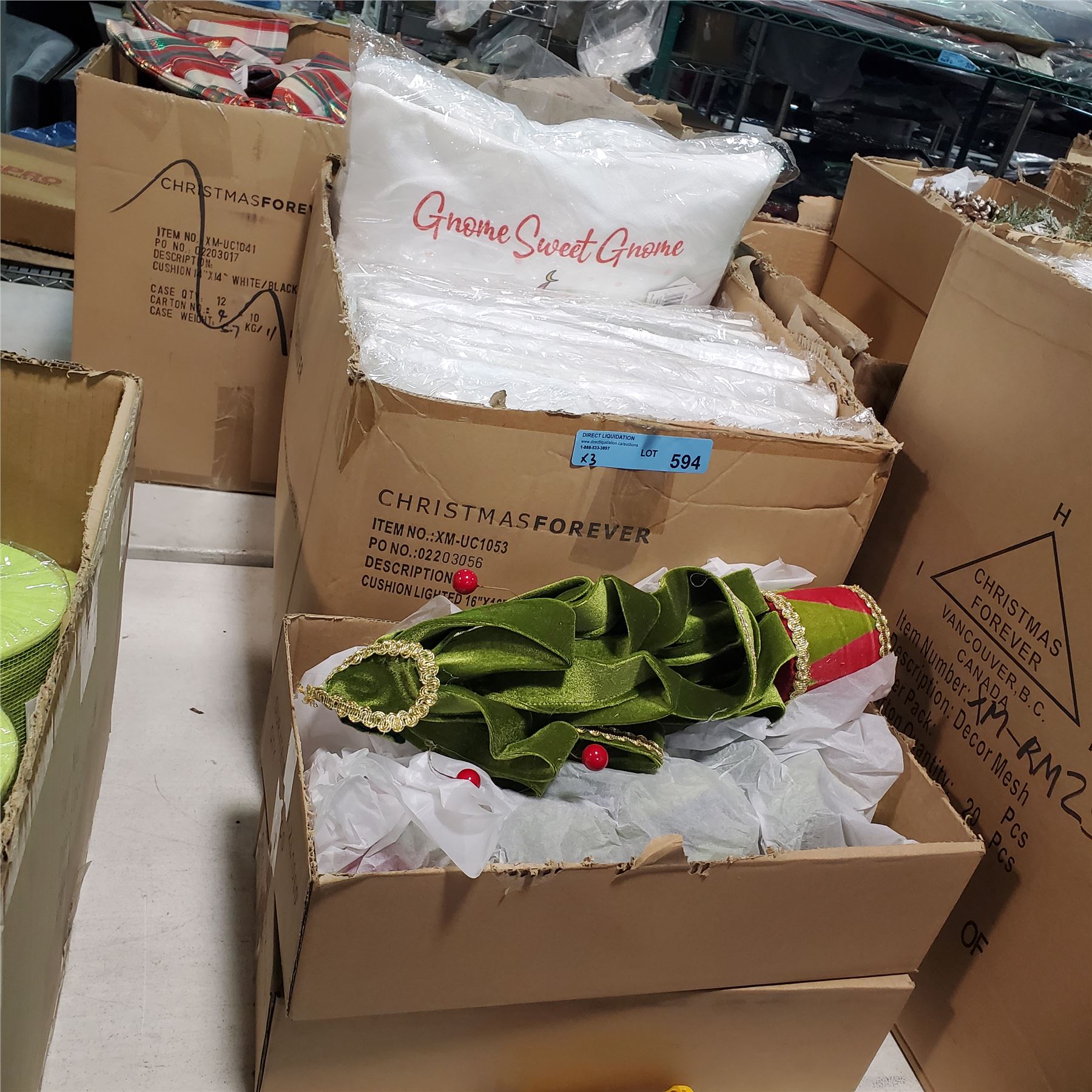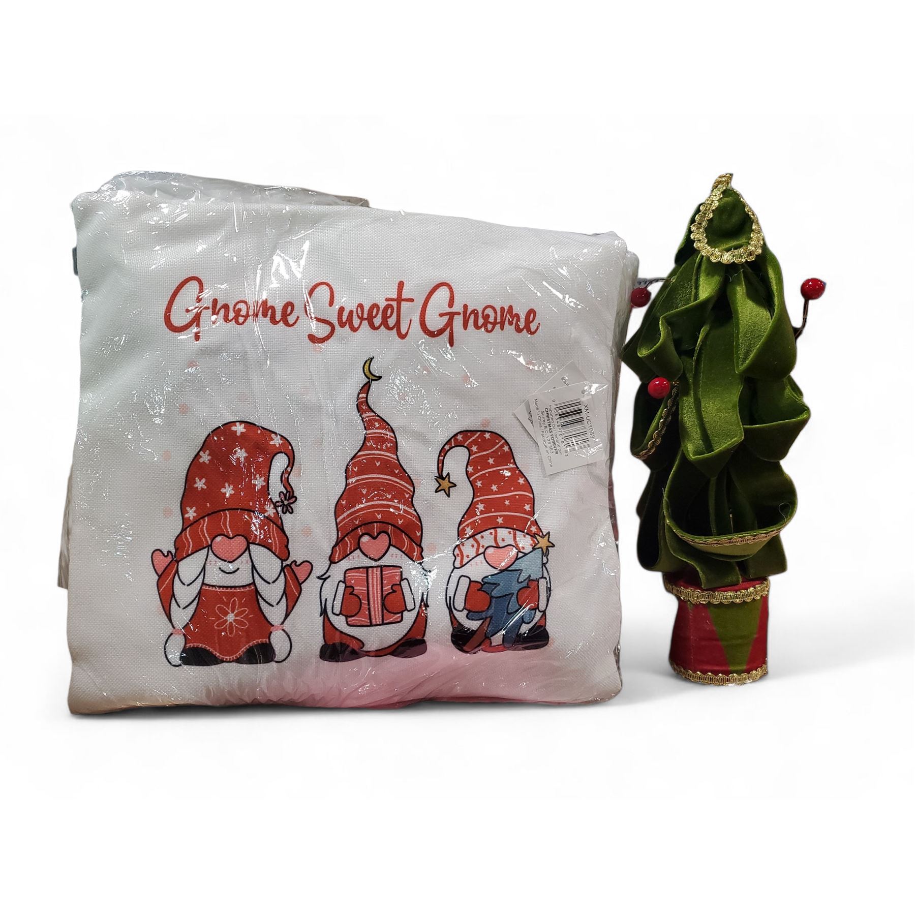 NEW Christmas Deco & Cushions - includes 12 16"x16" "Gnome Sweet Gnome" Cushions, & 4 Fabric Decorative Table Top Cone Christmas Trees