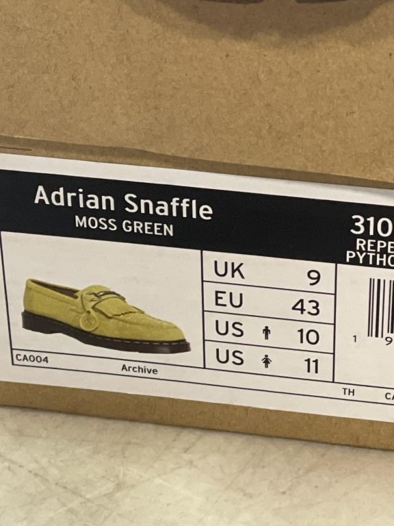 NEW DR. MARTENS ADRIAN SNAFFLE MOSS GREEN, REPELLO CALF PYTHON EMBOSS, SIZE US MENS 10, LADIES 11