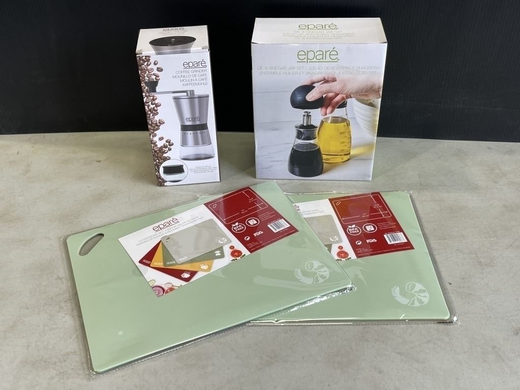 NEW EPARE OIL AND VINEGAR GLASS JAR SET, STAINLESS METAL COFFEE GRINDER, AND 2 3PC CUTTING BOARD SET