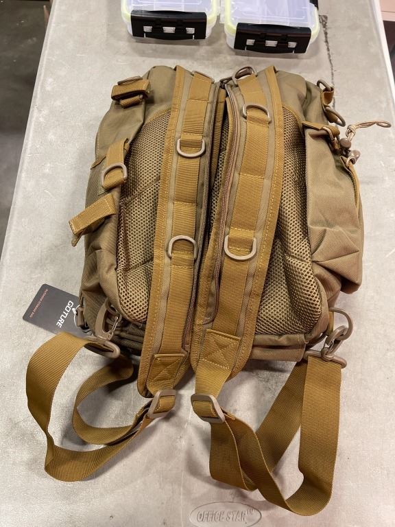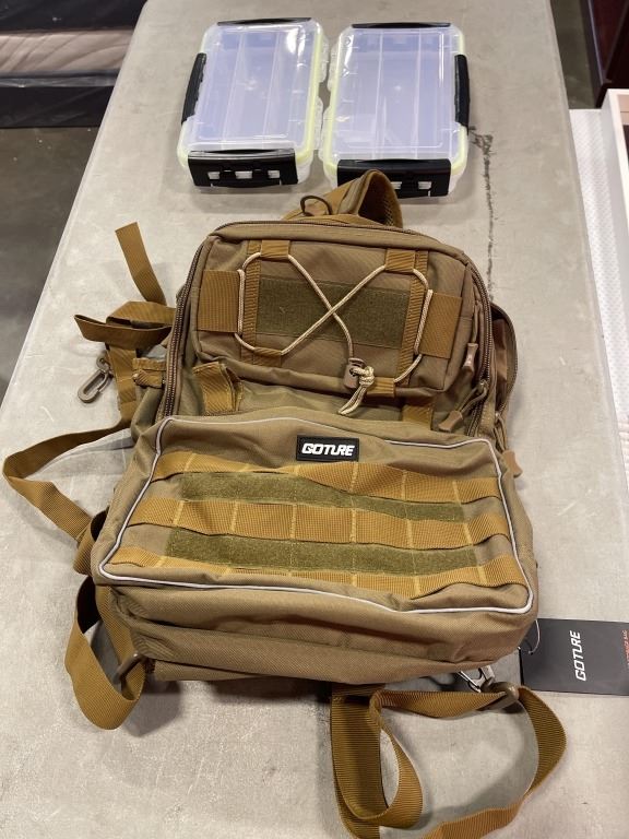 NEW FISHING BACKPACK WITH 2 PLASTIC TACKLE ORGANIZERS, RETAIL $140