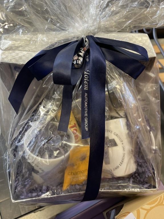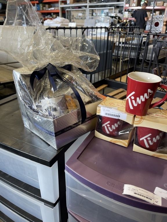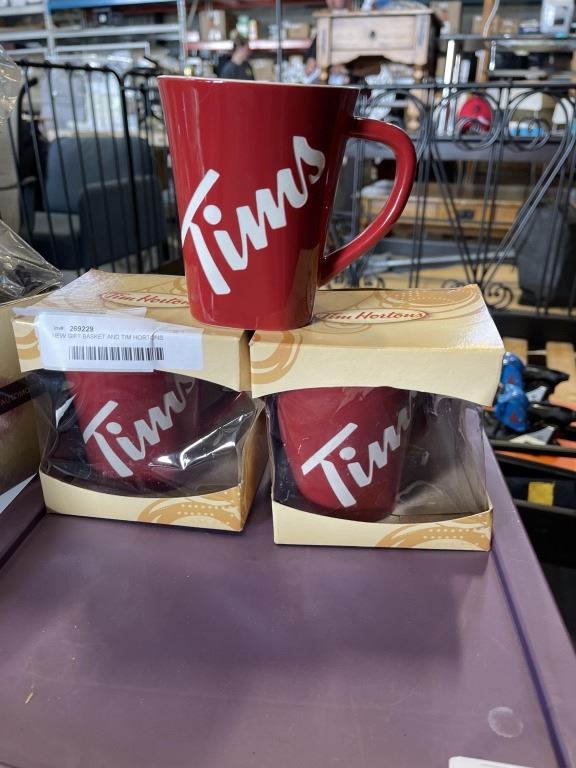NEW GIFT BASKET AND TIM HORTONS MUGS