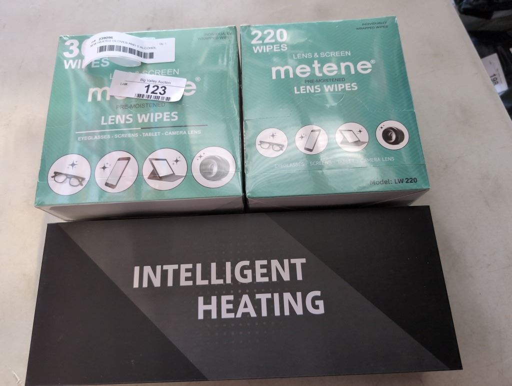 NEW HEATED GLOVES AND 2 ALCOHOL WIPE BOXES, 220 AND 300PC COUNTS