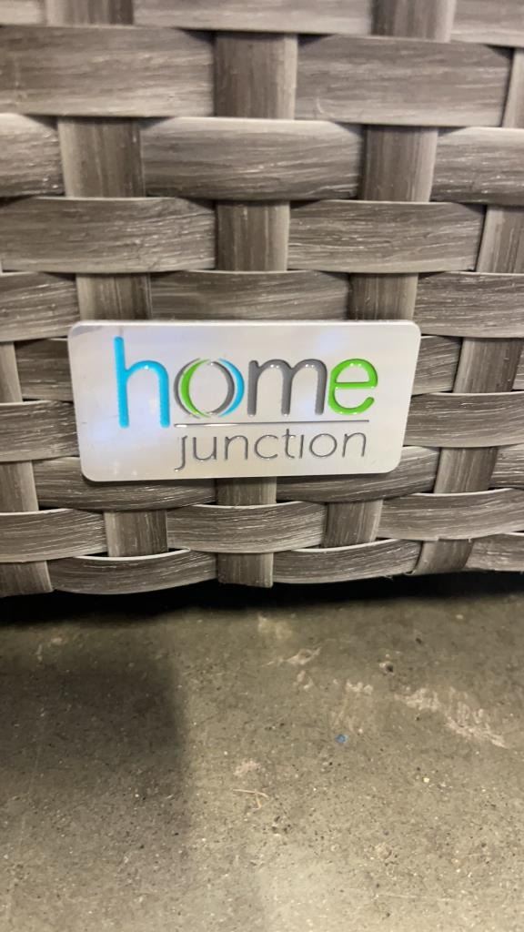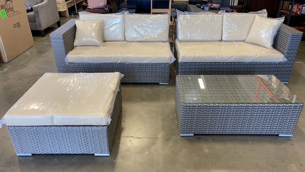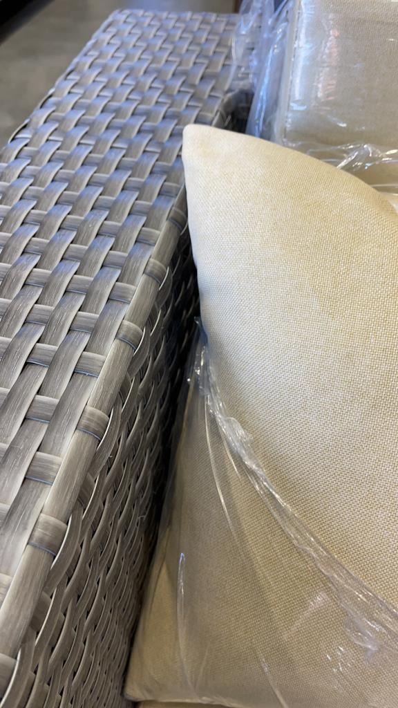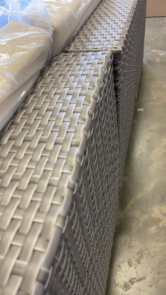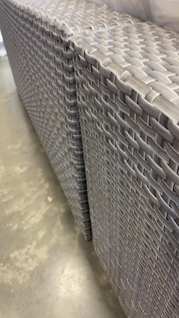NEW HOME JUNCTION 3 PIECE OUTDOOR PATIO SECTIONAL W/ COFFEE TABLE - BEIGE CUSHIONS AND GREY WICKER,