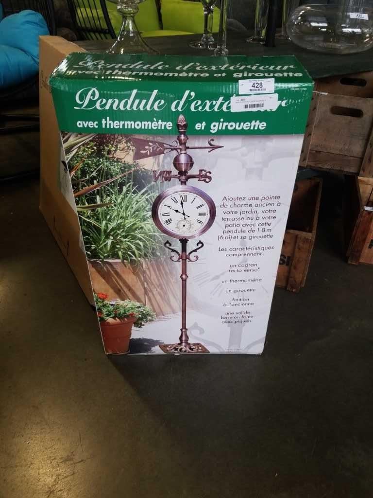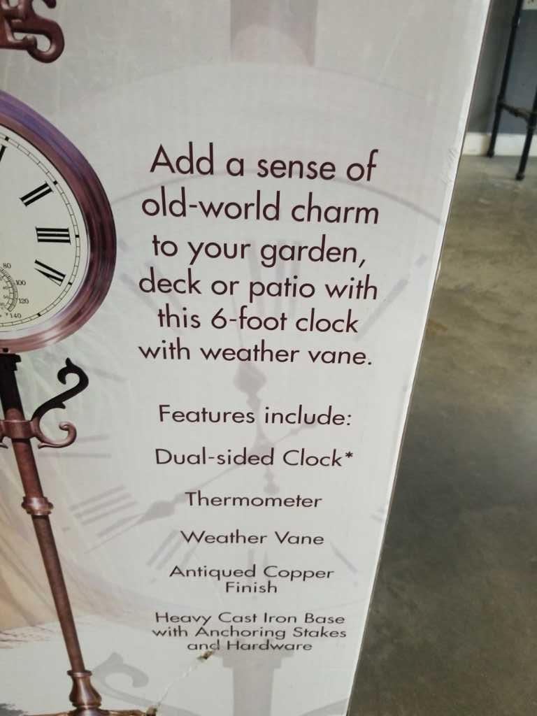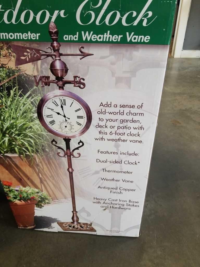 NEW IN BOX OUTDOOR OLD WORLD WEATHER VANE CLOCK W/ ANTIQUE COPPER FINISH, CAST IRON BASE, THERMOMETER, AND DUAL SIDED CLOCK - 6FT TALL