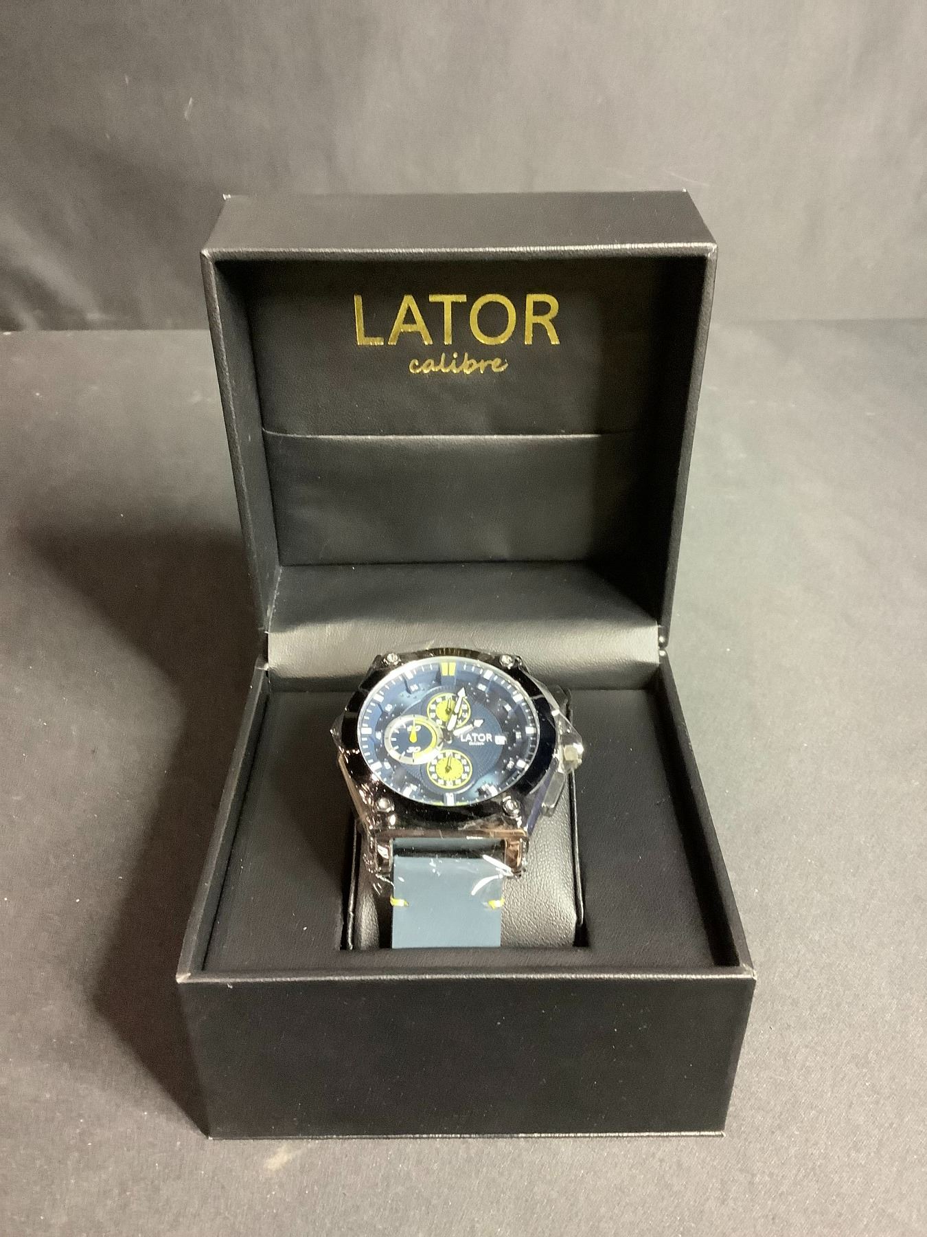 NEW MEN'S LATOR CALIBRE L9180 CHRONOGRAPH WATCH, 42 MM CASE, BLUE DIAL WITH YELLOW DETAILING, BLUE LEATHER STRAP, CHRONOGRAPH MOVEMENT WITH DATE FUNCTION