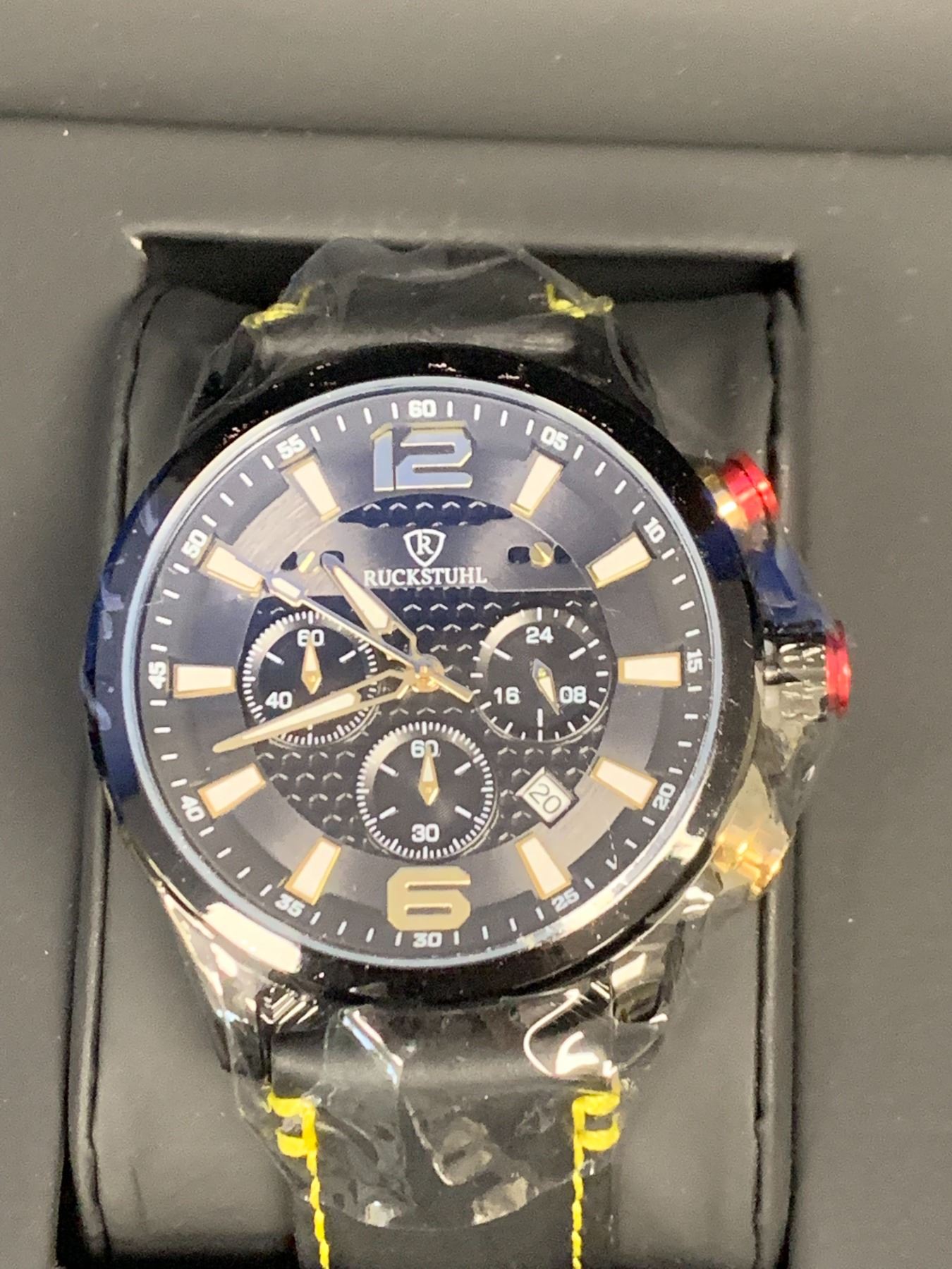 NEW MEN'S RUCKSTUHL CHRONOGRAPH WATCH, MODEL R120, BLACK MULTI-FUNCTION DIAL, BLACK GENUINE