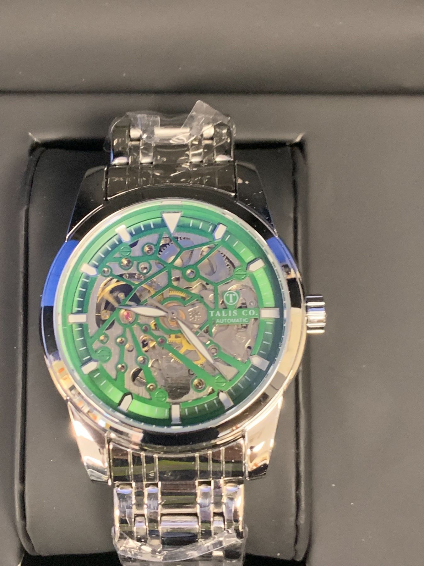 NEW MEN'S TALIS CO 7820 AUTOMATIC WATCH, BLACK SKELETON DIAL AND CASE, STAINLESS STEEL STRAP,