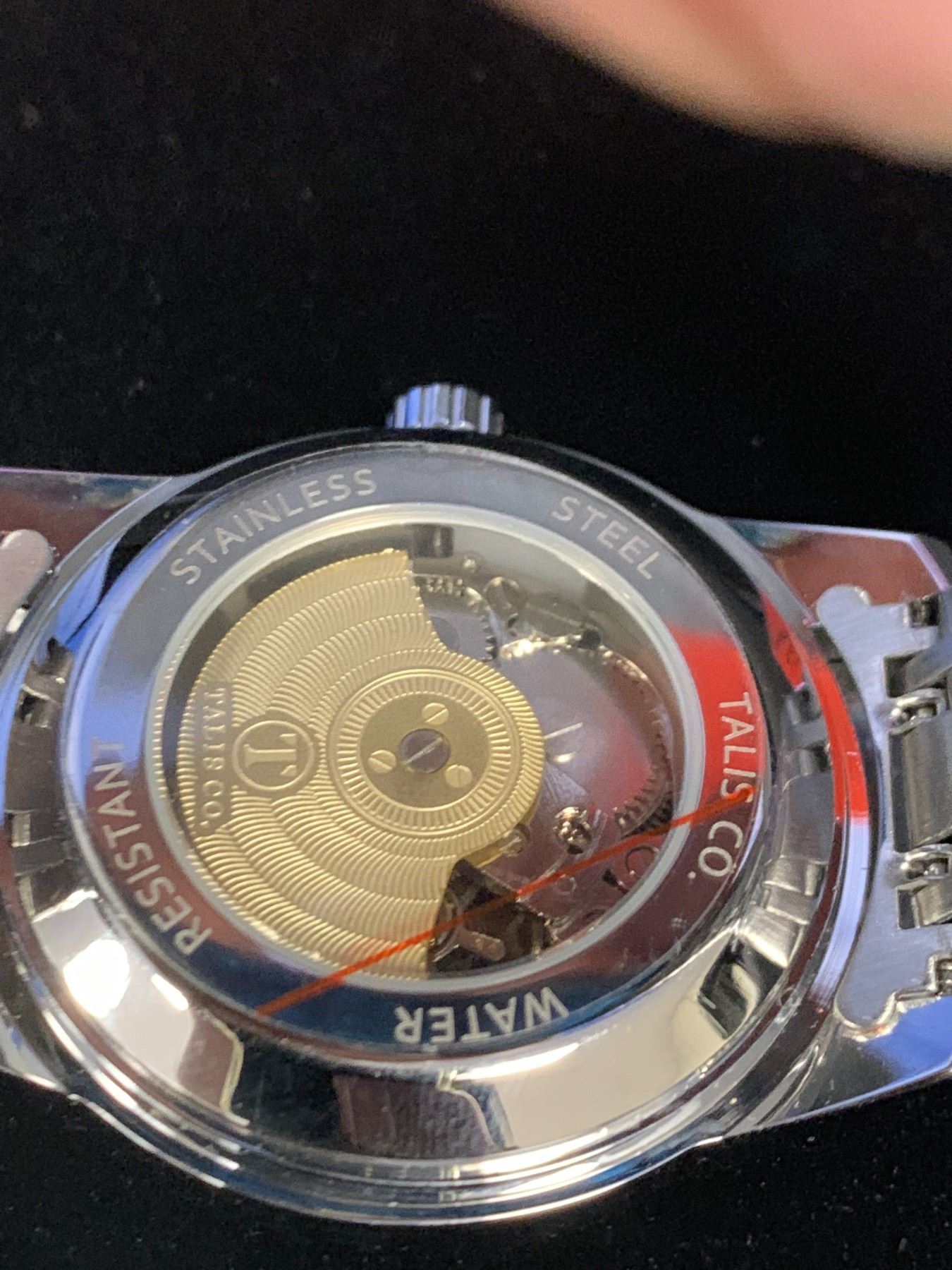 NEW MEN'S TALIS CO 7820 AUTOMATIC WATCH, BLACK SKELETON DIAL AND CASE, STAINLESS STEEL STRAP, NEW BACKCASE