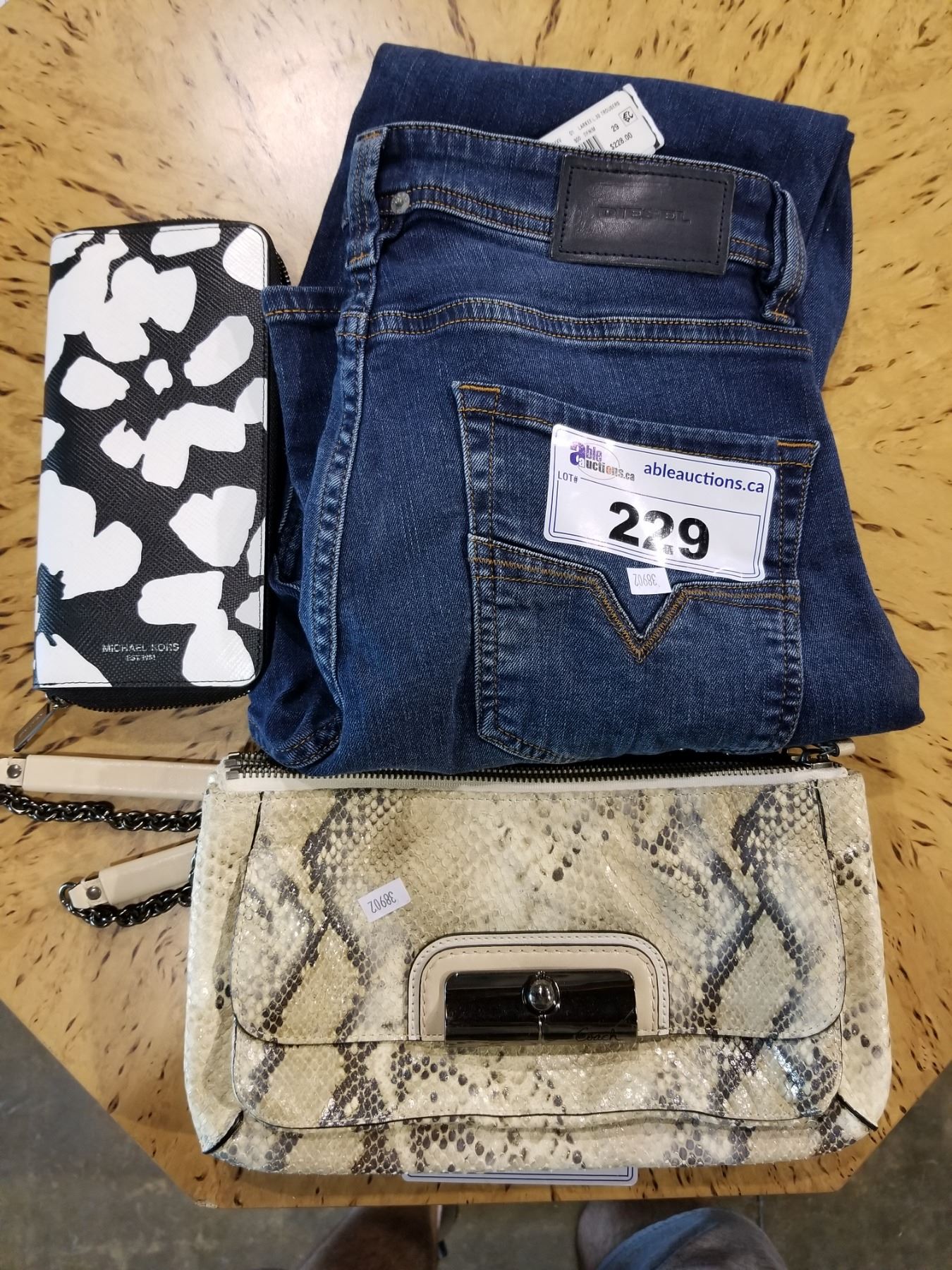 NEW MICHAEL KORS WALLET (RETAIL $195), NEW DIESEL JEANS SZ 29 (RETAIL $228), & NEW COACH PURSE