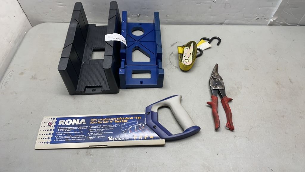 NEW MITRE SAW WITH 2 BOXES, RATCHET STRAP AND TIN SNIPS