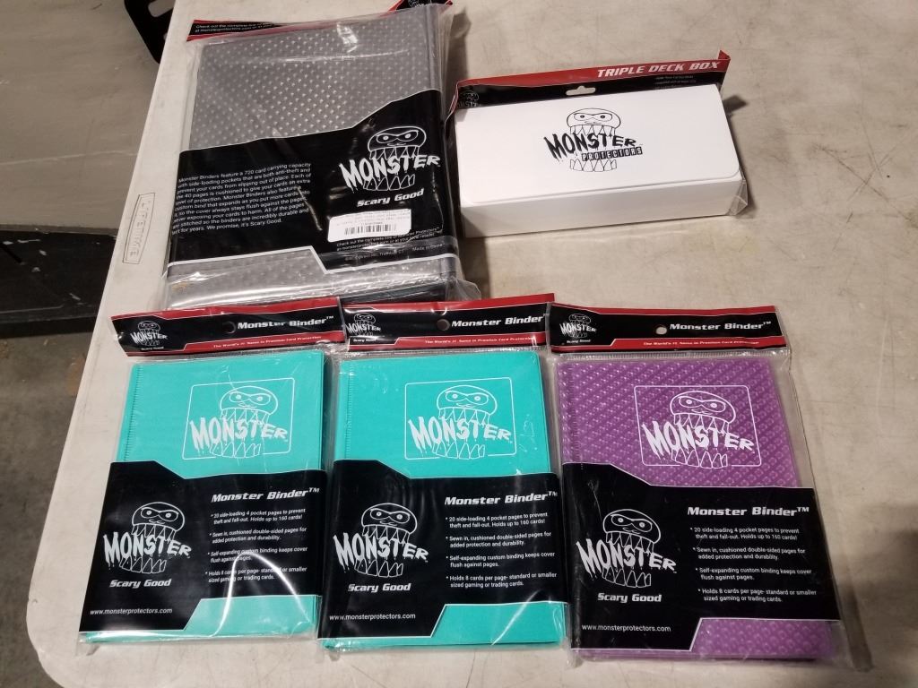 NEW MONSTER 720 CARD SIDE LOADING BINDER, 3 160 CARD SIDE LOAD BINDERS AND TRIPLE DECK BOX