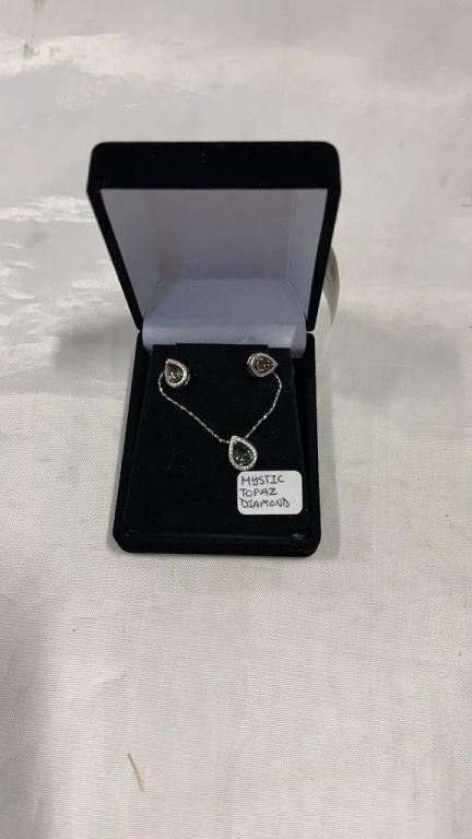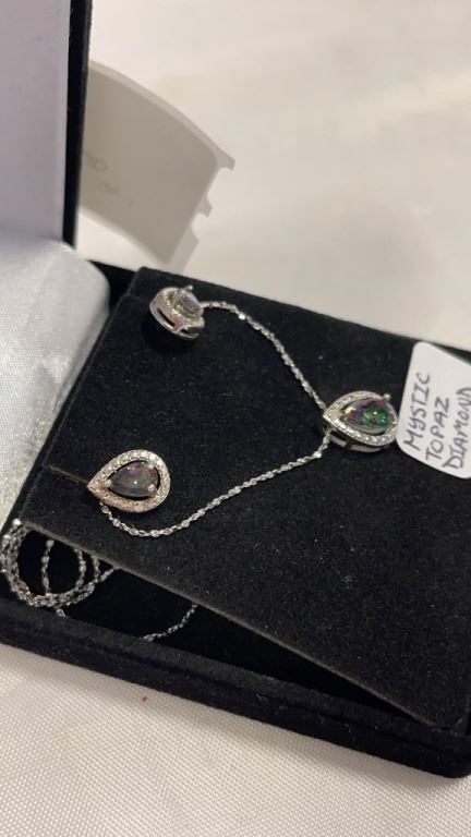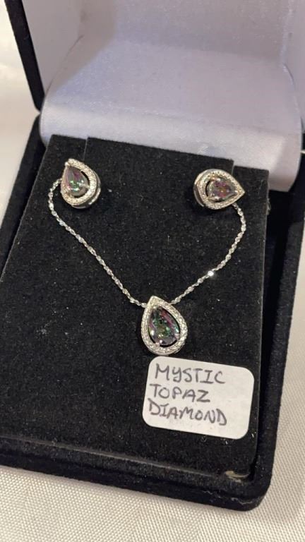 NEW MYSTIC TOPAZ AND DIAMOND STUD EARRINGS, 2 DIAMONDS, 2CT PEARCUTMYSTIC TOPAZ, STERLING SILVER RETAIL VALUE $225
