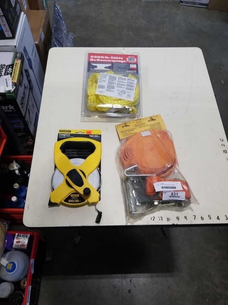NEW OLD STOCK STANLEY 100 FOOT MEASURING TAPE, 27 FOOT RATCHET TIE DOWN AND 6000LB TOW CABLE