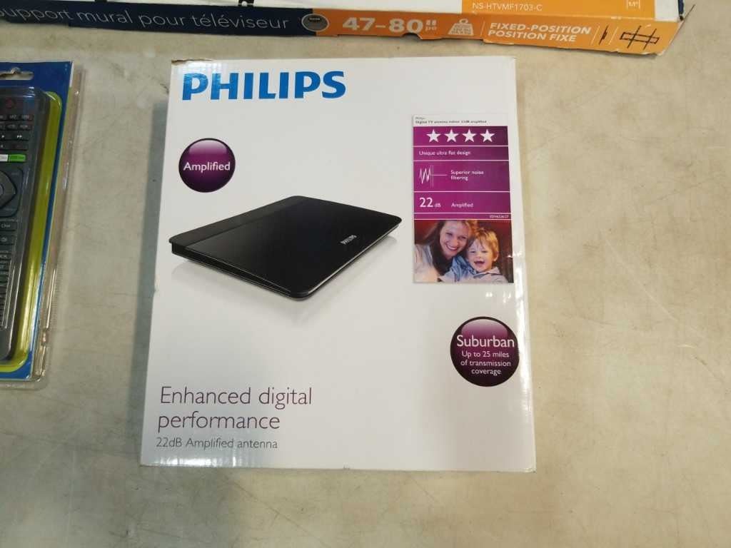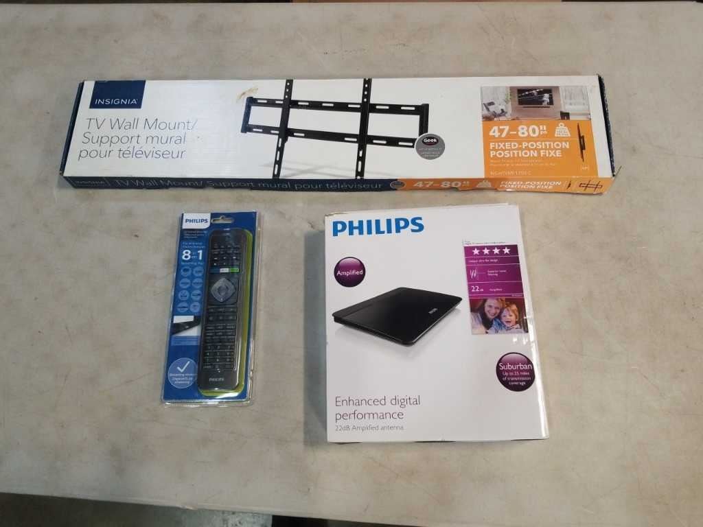 NEW OVERSTOCK INSIGNIA 47-80 INCH FIXED POSITION WALL MOUNT, PHILIPS 22DB AMPLIFIED HDTV DIGITAL ANTENNA AND 8 IN 1 REMOTE
