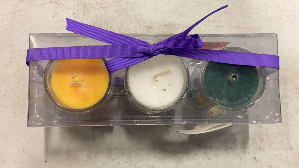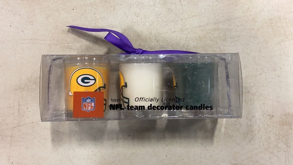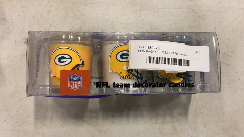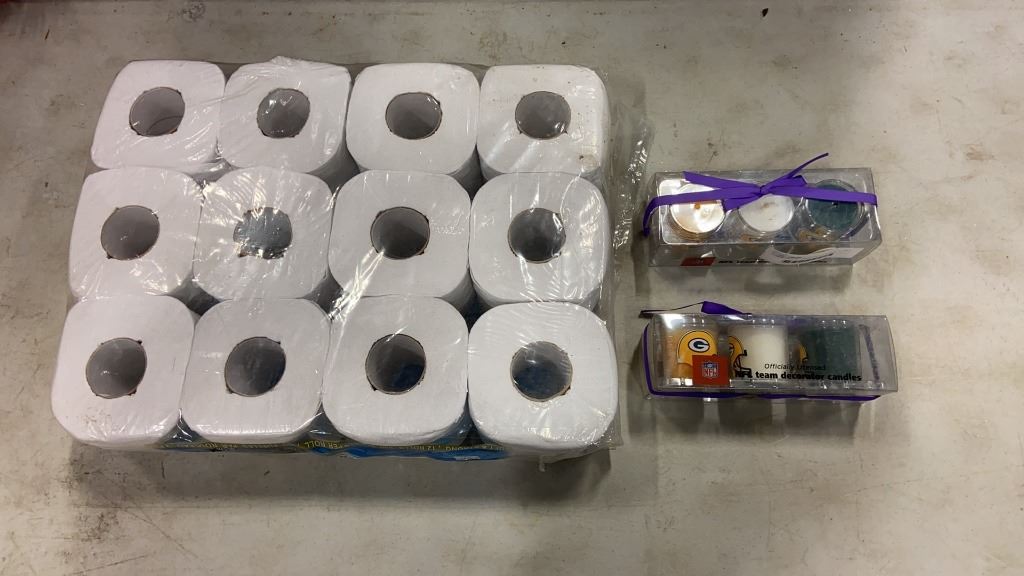 NEW PACK OF TOILET PAPER, AND 2 THREE PACKS OF GREEN BAY PACKERS CANDLES