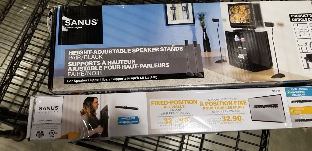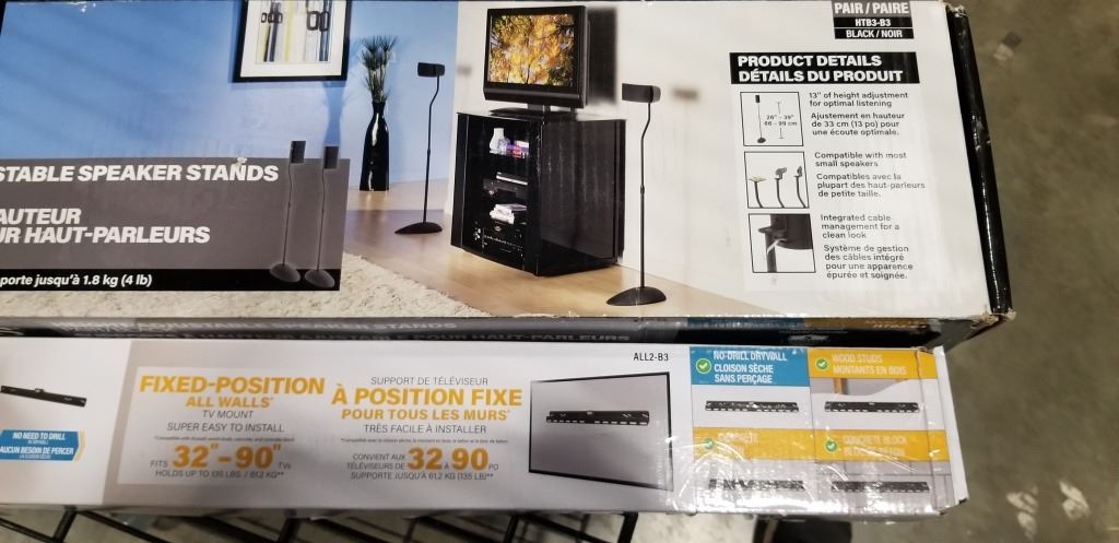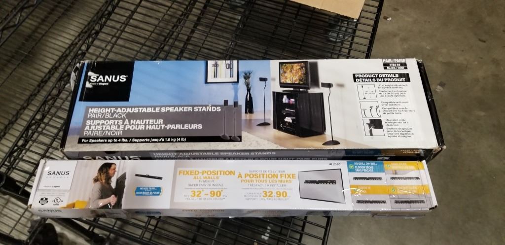 NEW PAIR OF SANUS HEGHT ADJUSTABLE BLACK SPEAKER STANDS AND 32-90 INCH FIXED TV WALL MOUNT