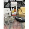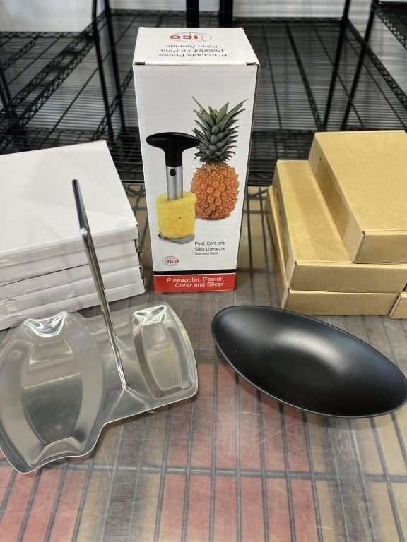 NEW PINEAPPLE PEELER, CORER AND SLICER, 5 NEW MULTI USE DISHWASHGER SAFE BLACK DISHES, AND 5 NEW STAINLESS SPOON RESTS