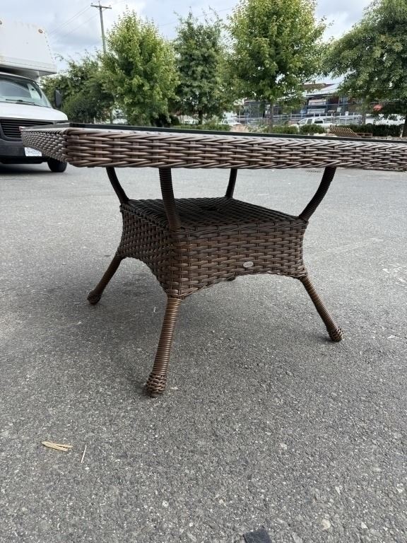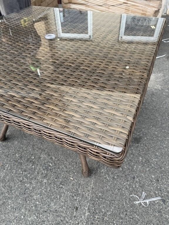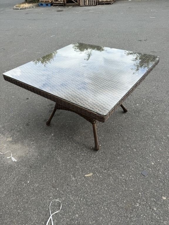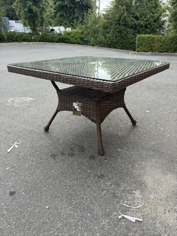 NEW RATANA 48 X 48 DARK BROWN OUTDOOR PATIO TABLE WITH TEMPERED GLASS TOP, RETAIL $599 USD 2 BOX LOT