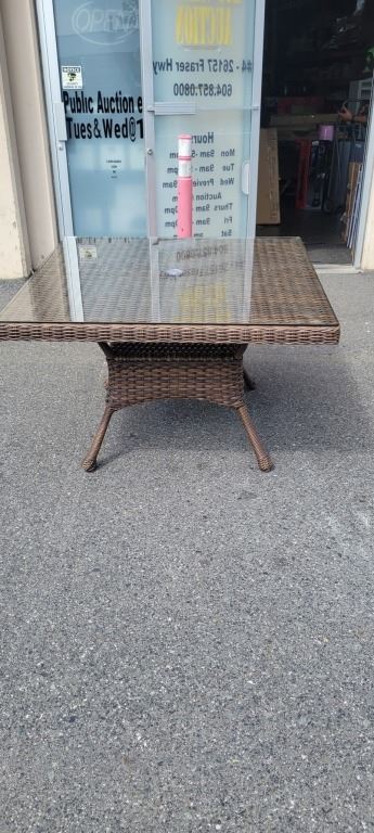 NEW RATANA 60 X 60 DARK BROWN OUTDOOR PATIO TABLE WITH TEMPERED GLASS TOP, RETAIL $999 USD 2 BOX LOT