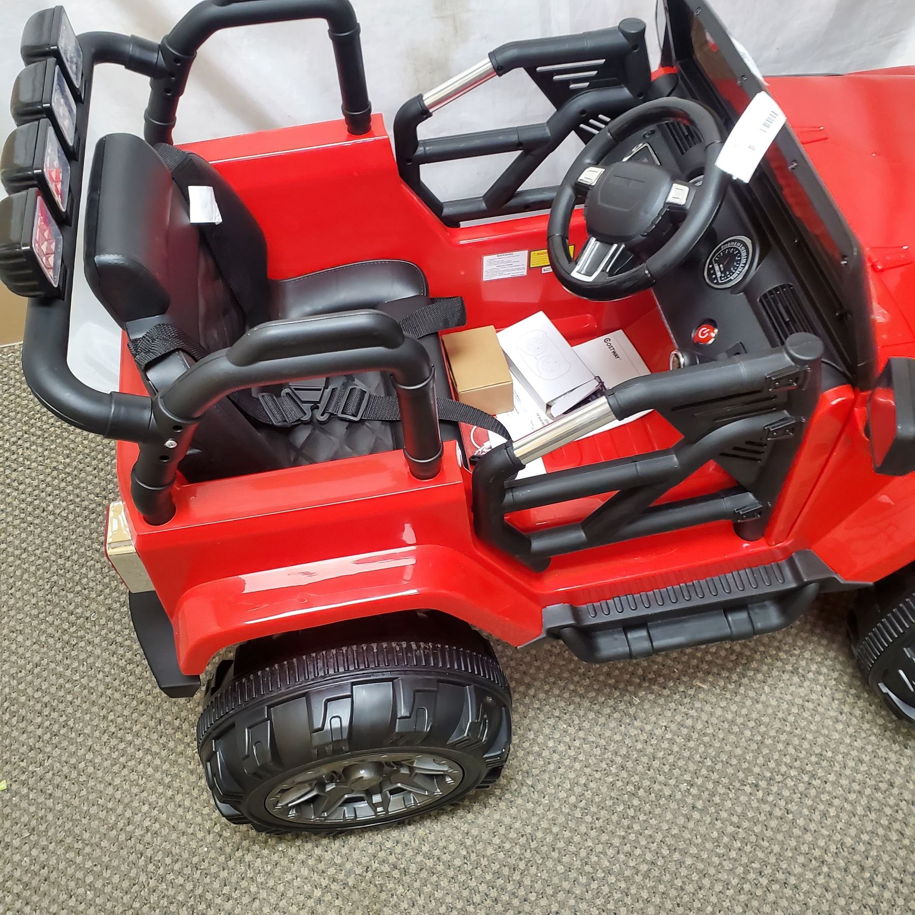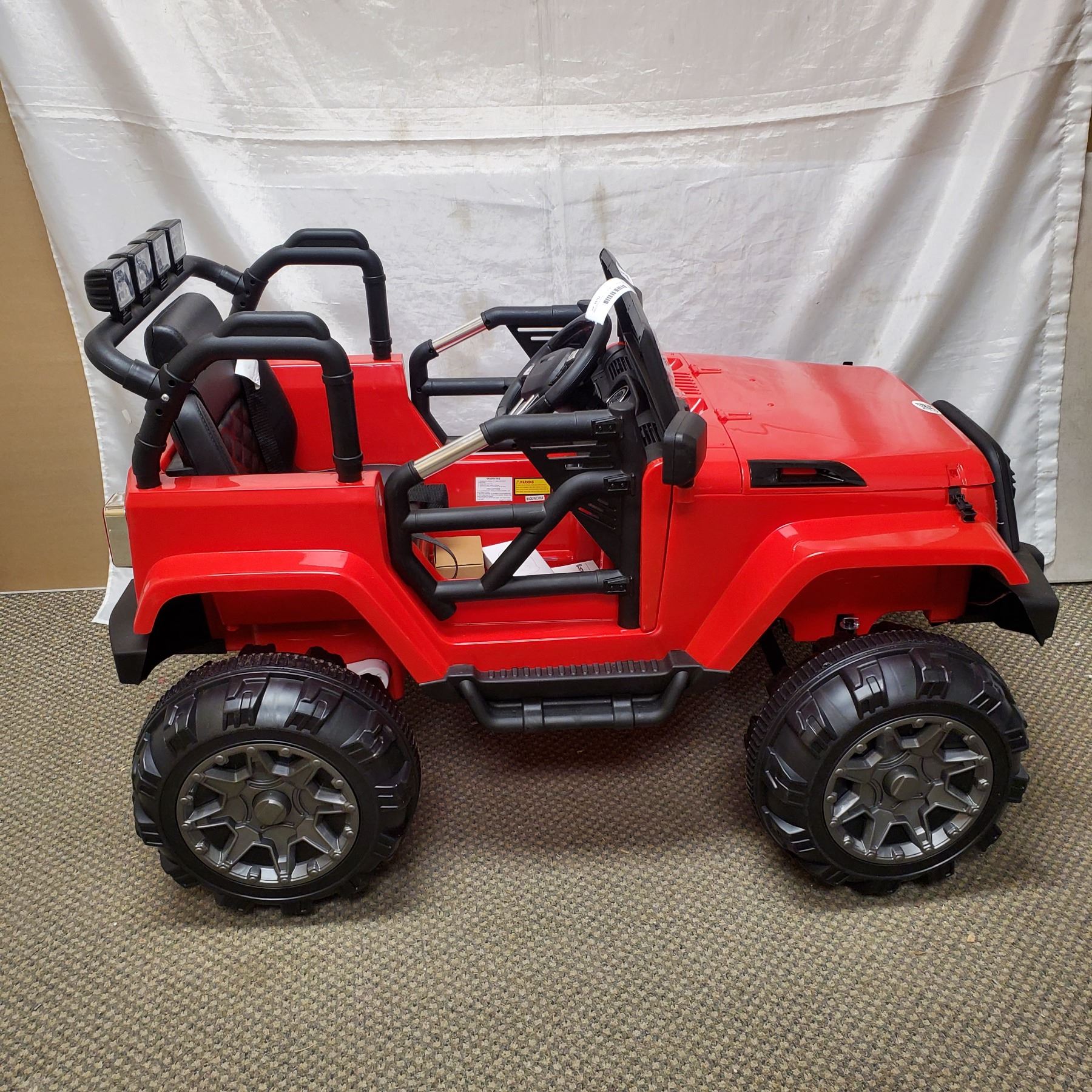 NEW RED KIDS RIDE ON JEEP, WITH REMOTE CONTROL AND AUDIO JACK, 12V, RETAIL $499