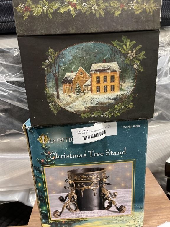 NEW SET OF CHRISTMASS NESTING BOXES, AND TRADITIONS HEAVY CAST TREE STAND