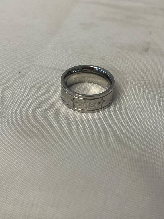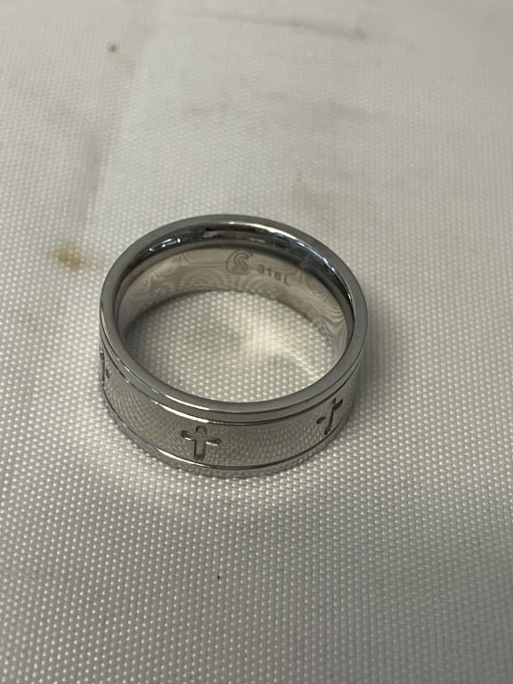 NEW STAINLESS STEEL RING BAND CROSSES DECOR, BRUSHED INSIDE SHANK, MARKED 316L