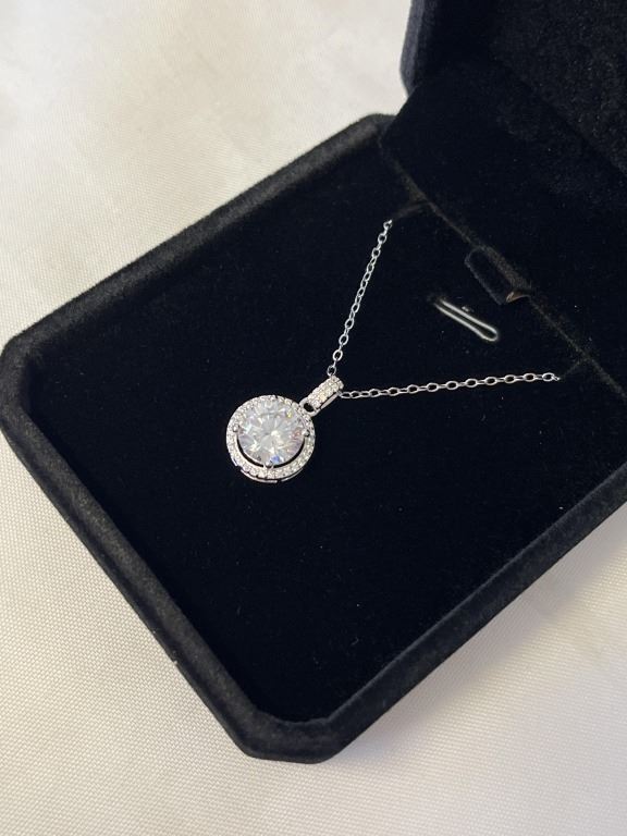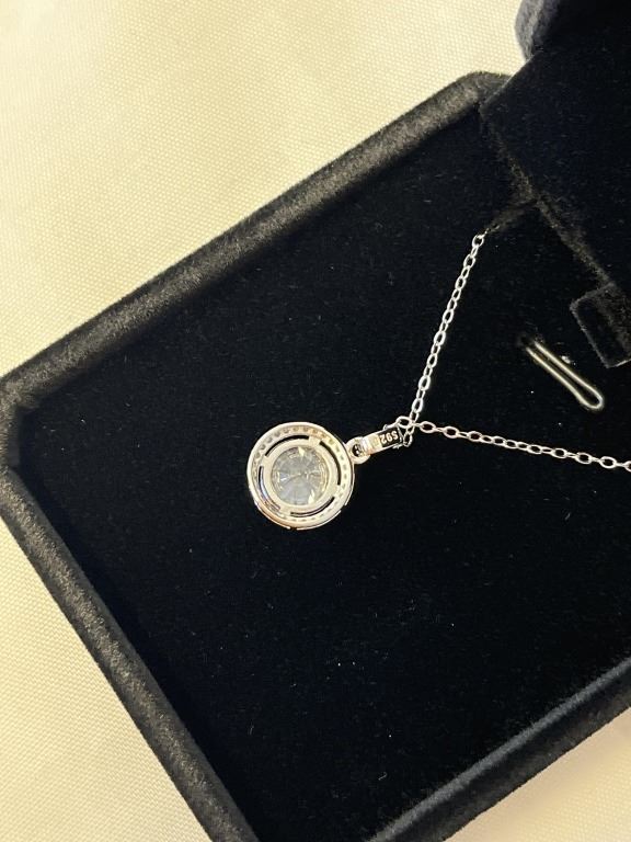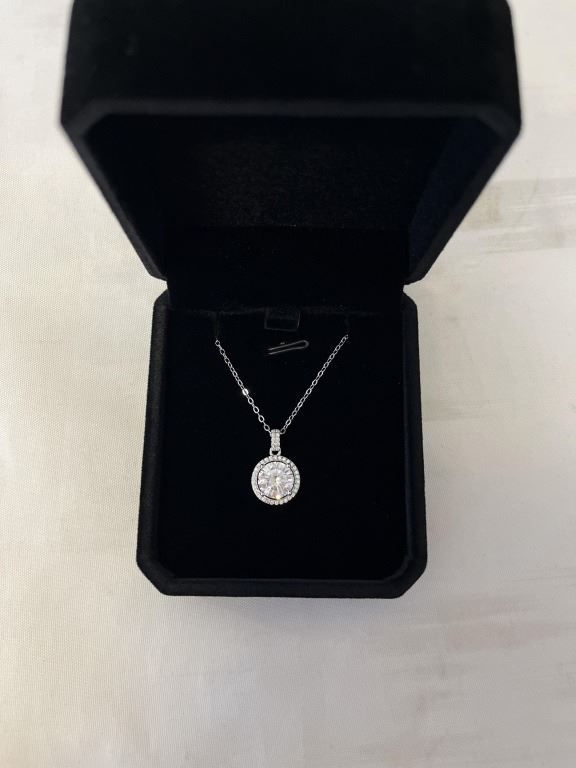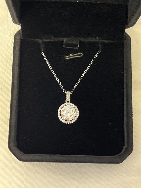 NEW STERLING SILVER 3CT SIMULATED DIAMOND (CZ) HALO NECKLACE, ADJUSTABLE 16"-18" MOUNTED IN 925 STERLING SILVER W/ WHITE GOLD OVERLAY