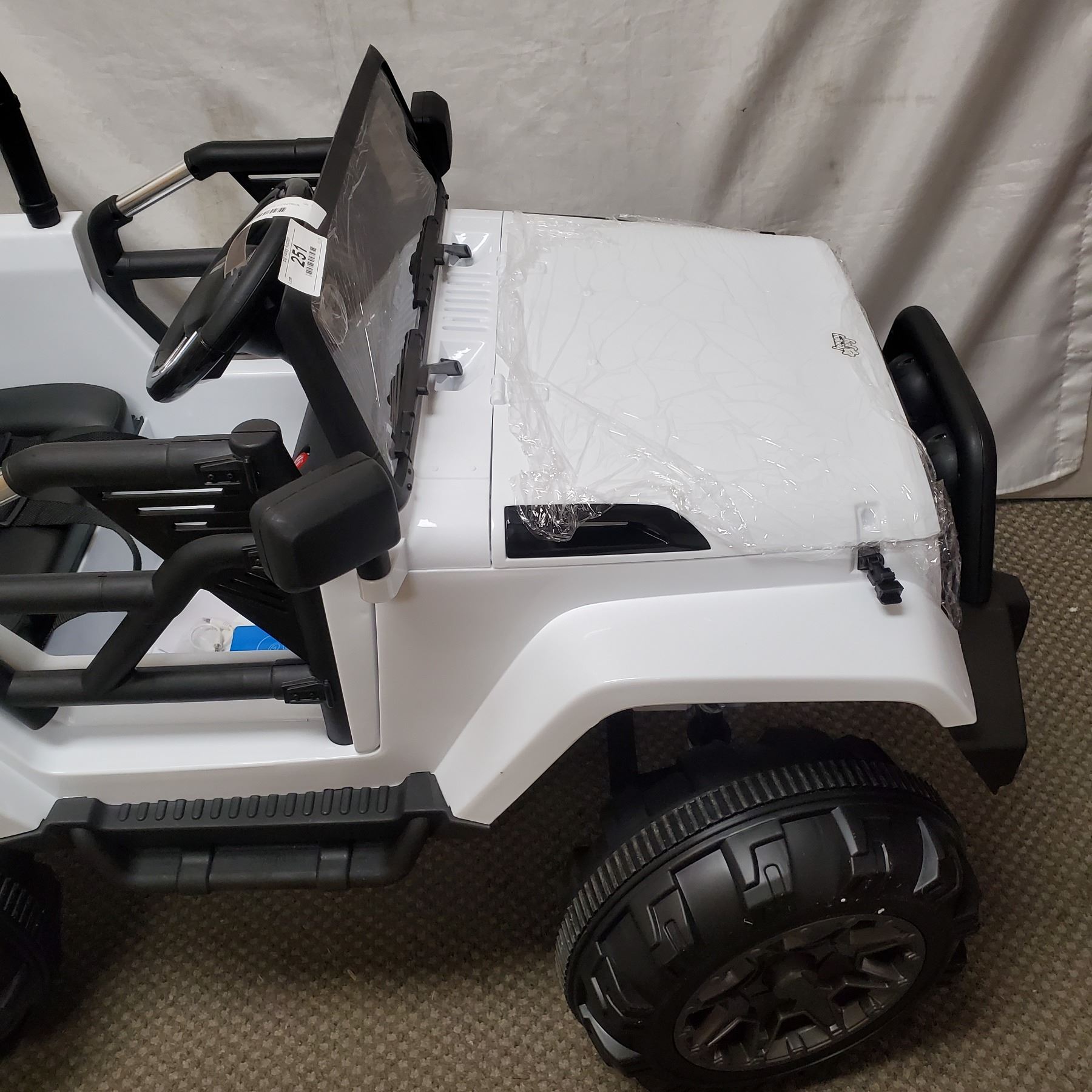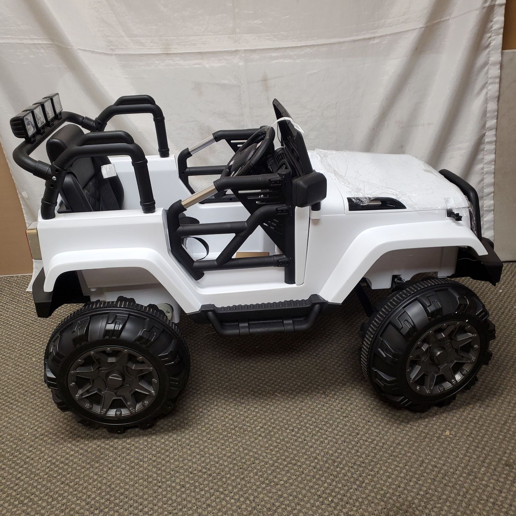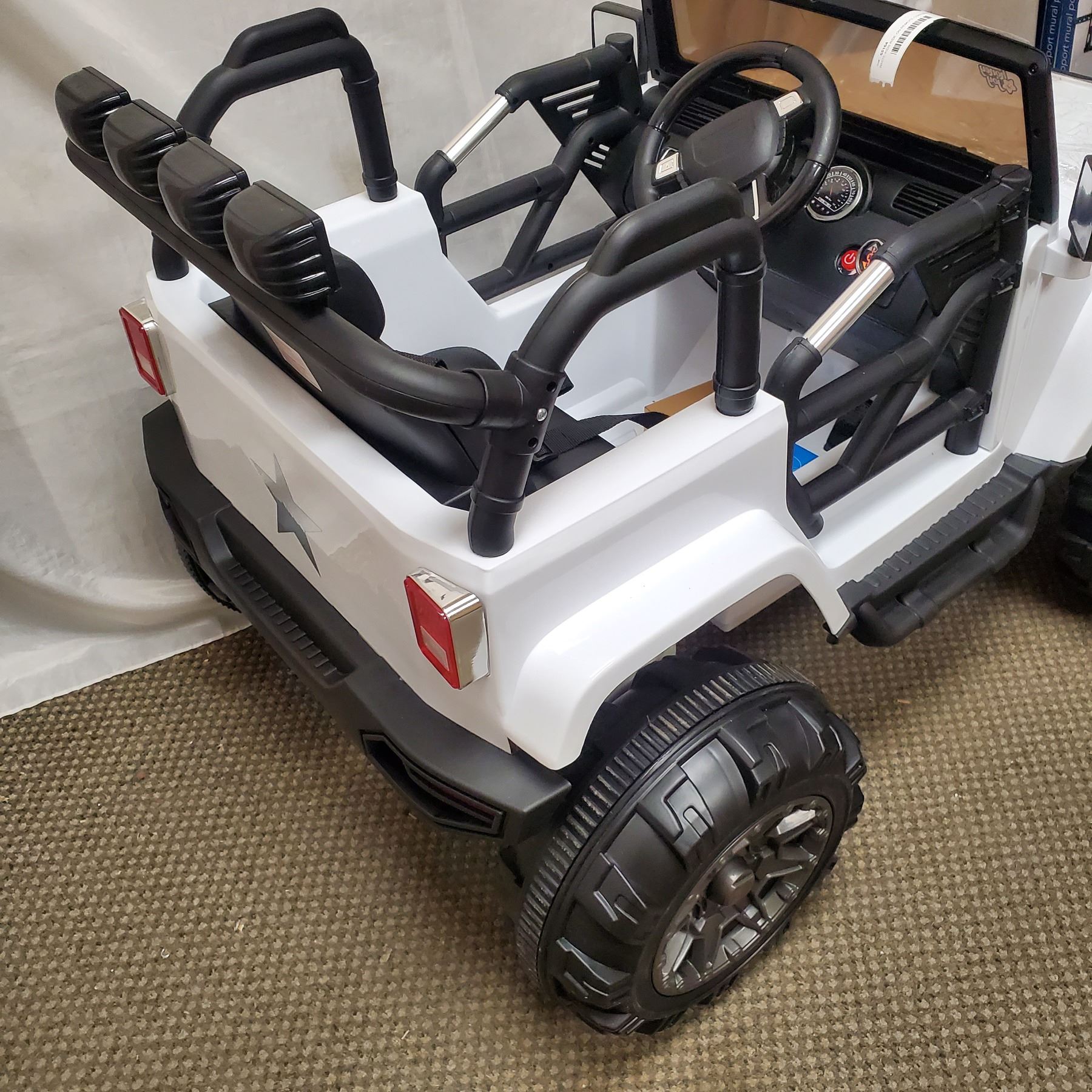 NEW WHITE KIDS RIDE ON JEEP, WITH REMOTE CONTROL AND AUDIO JACK, 12V, RETAIL $499, PRE BUILT