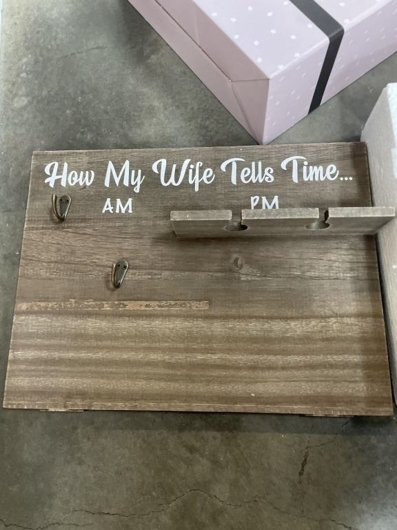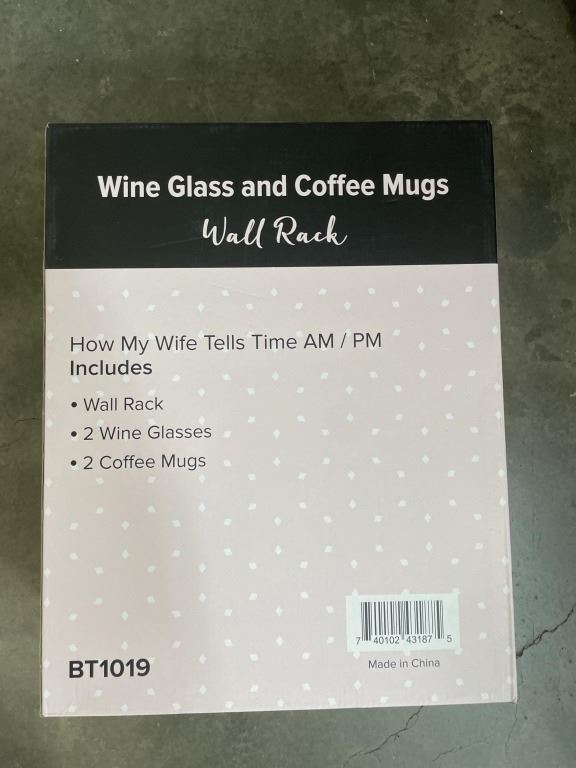 NEW WINE RACK WITH 2 WINE GLASSES AND 2 MUGS - HOW MY WIFE TELLS TIME, RETAIL $69