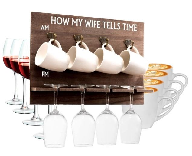 NEW WINE RACK WITH 4 WINE GLASSES AND 4 MUGS - HOW MY WIFE TELLS TIME, RETAIL $74